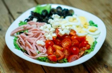 Lechuga verde, jamón, aceituna, huevo cocido, tomate cherry, queso mozzarella fresco, aderezo César (preparación de la casa).