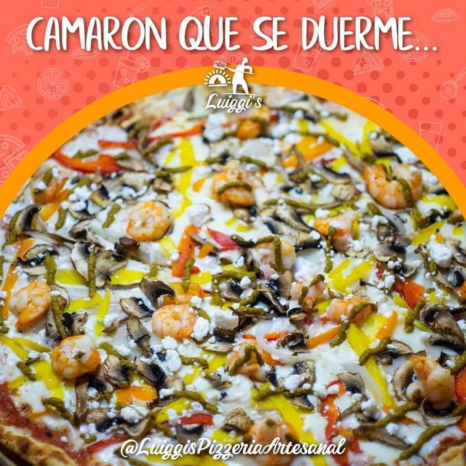 Base con camarón, cebolla, champiñón, pimientos, pesto de morrón rojo y queso feta. Chica.