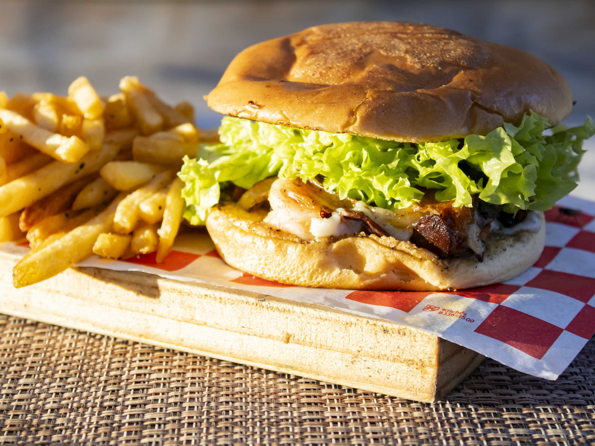 Carne de res (200gr), queso amarillo, cebolla asada, lechuga, tomate, guacamole y tocino. Incluye papas, cátsup, mostaza y aderezo ranch.