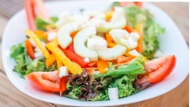 Lechugas mixtas, pepino, tomate, zanahoria, pimientos, mozzarella y aderezo champagne.