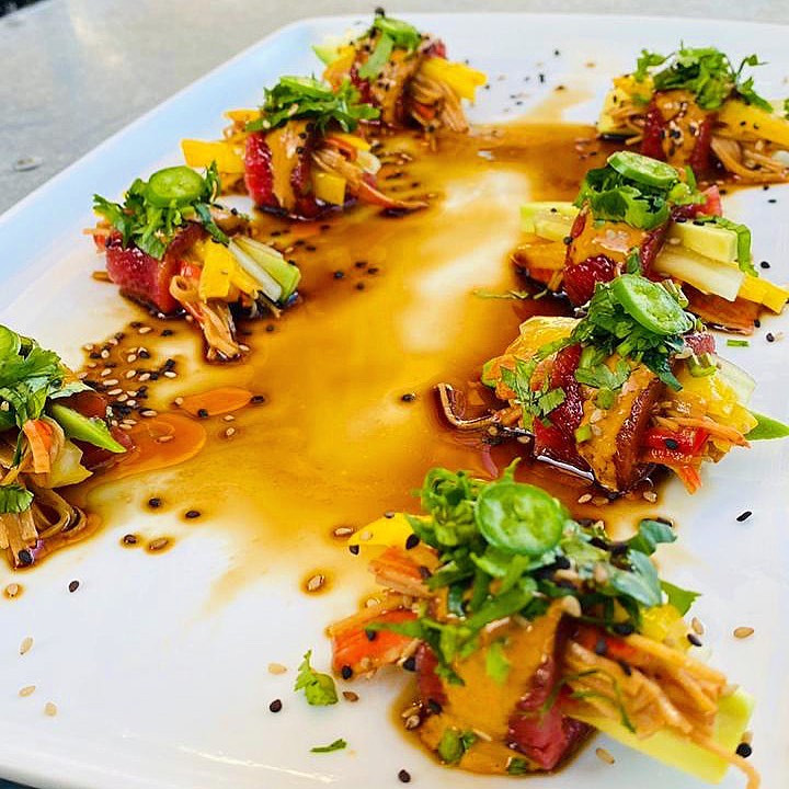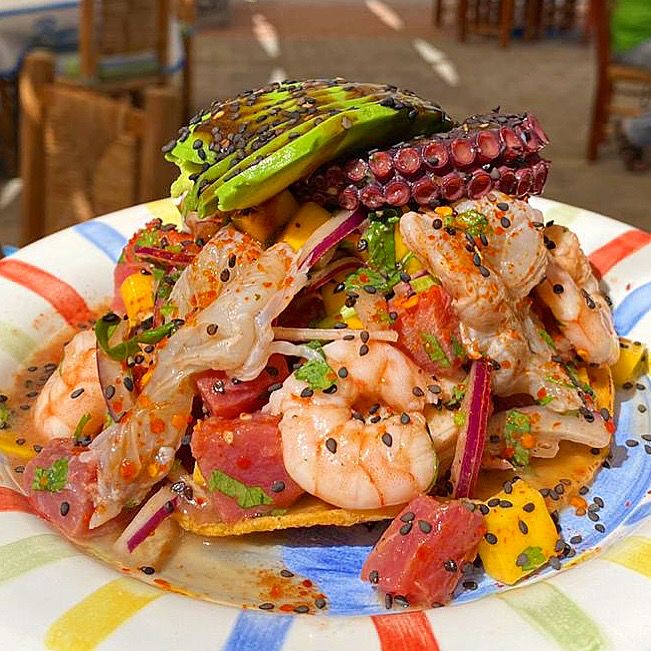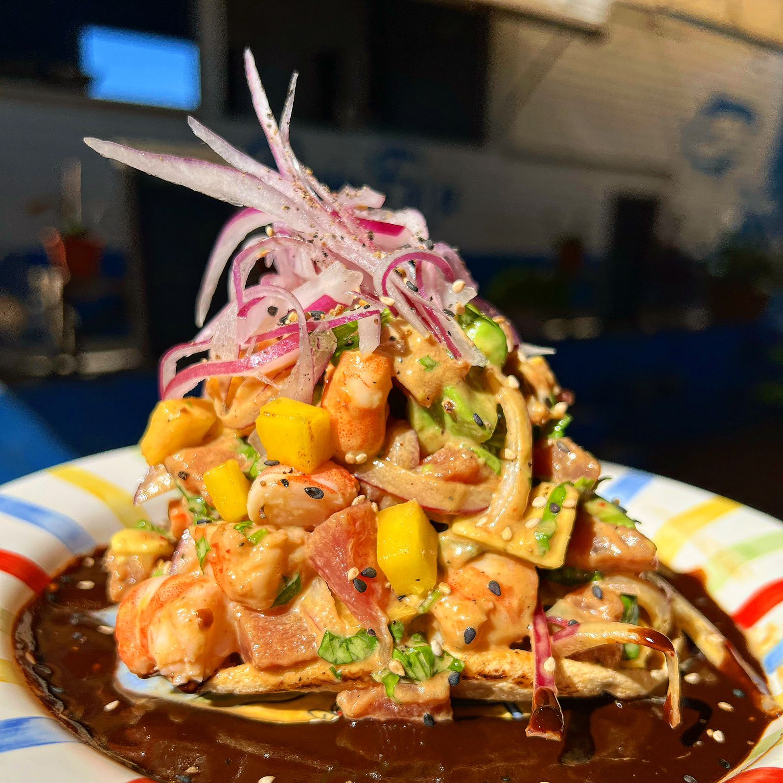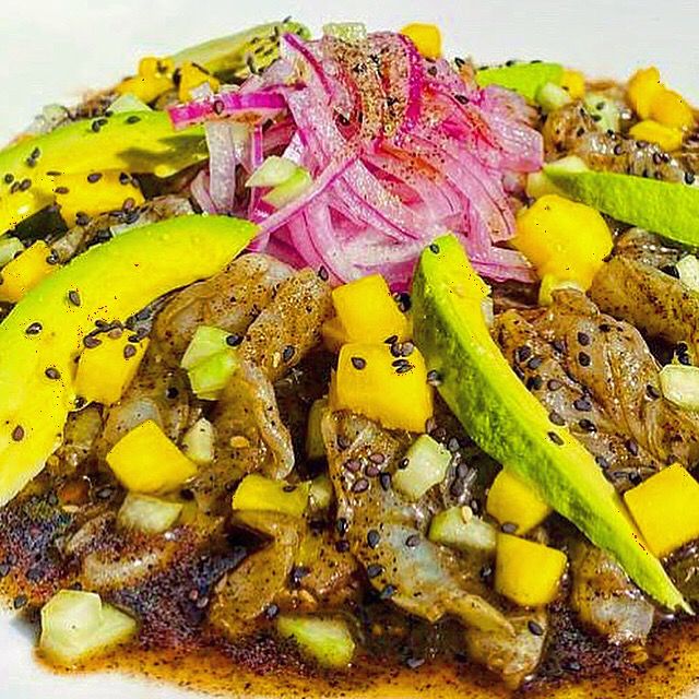 Camarón cocido, tuna, alioli de chipotle, cilantro, salseado de la casa, cebolla, mango y aguacate.