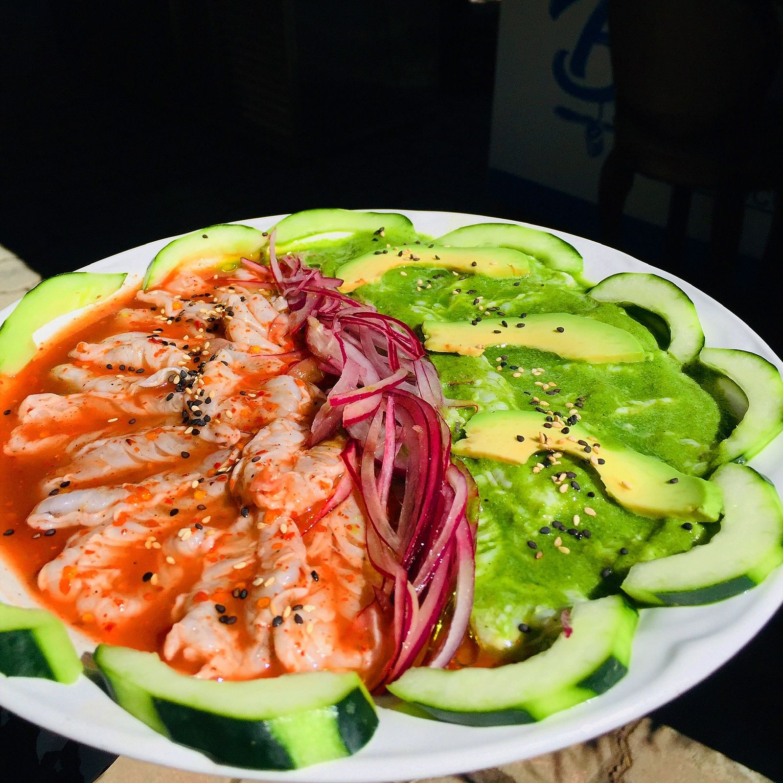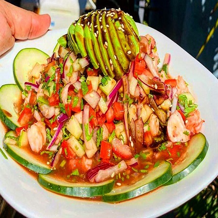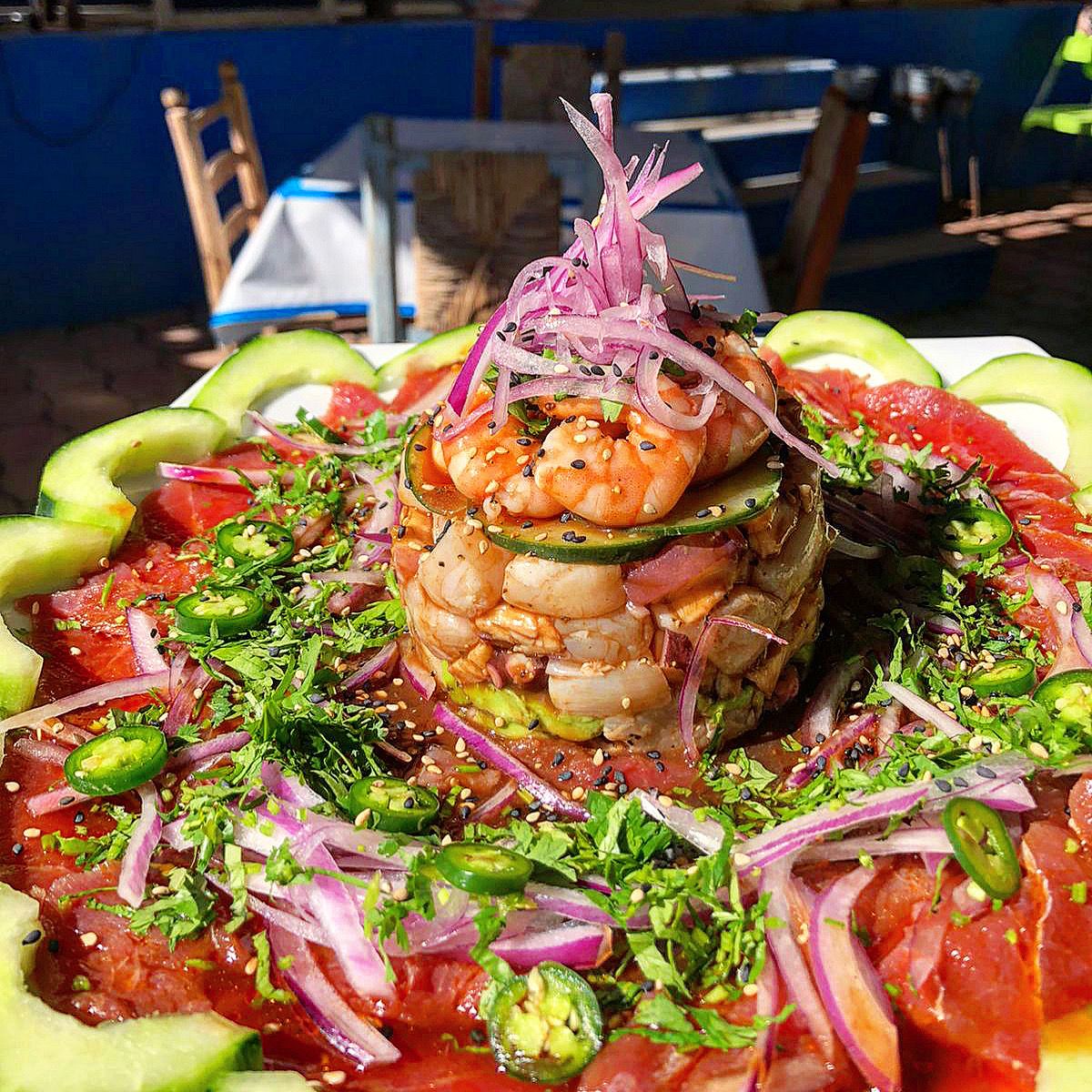 Combinación de camarón aguachile, camarón cocido, pescado, pulpo, callo y saludado de la casa.