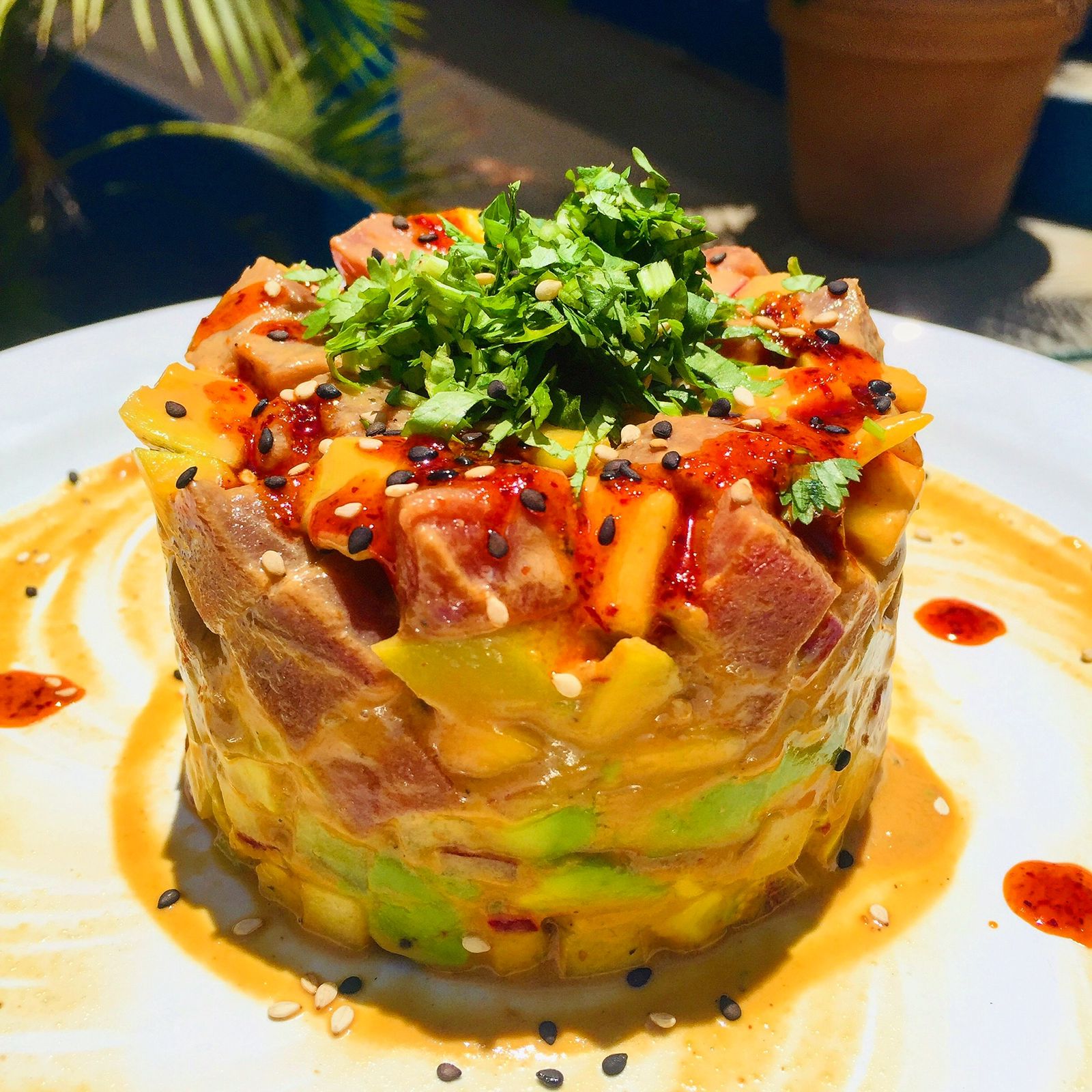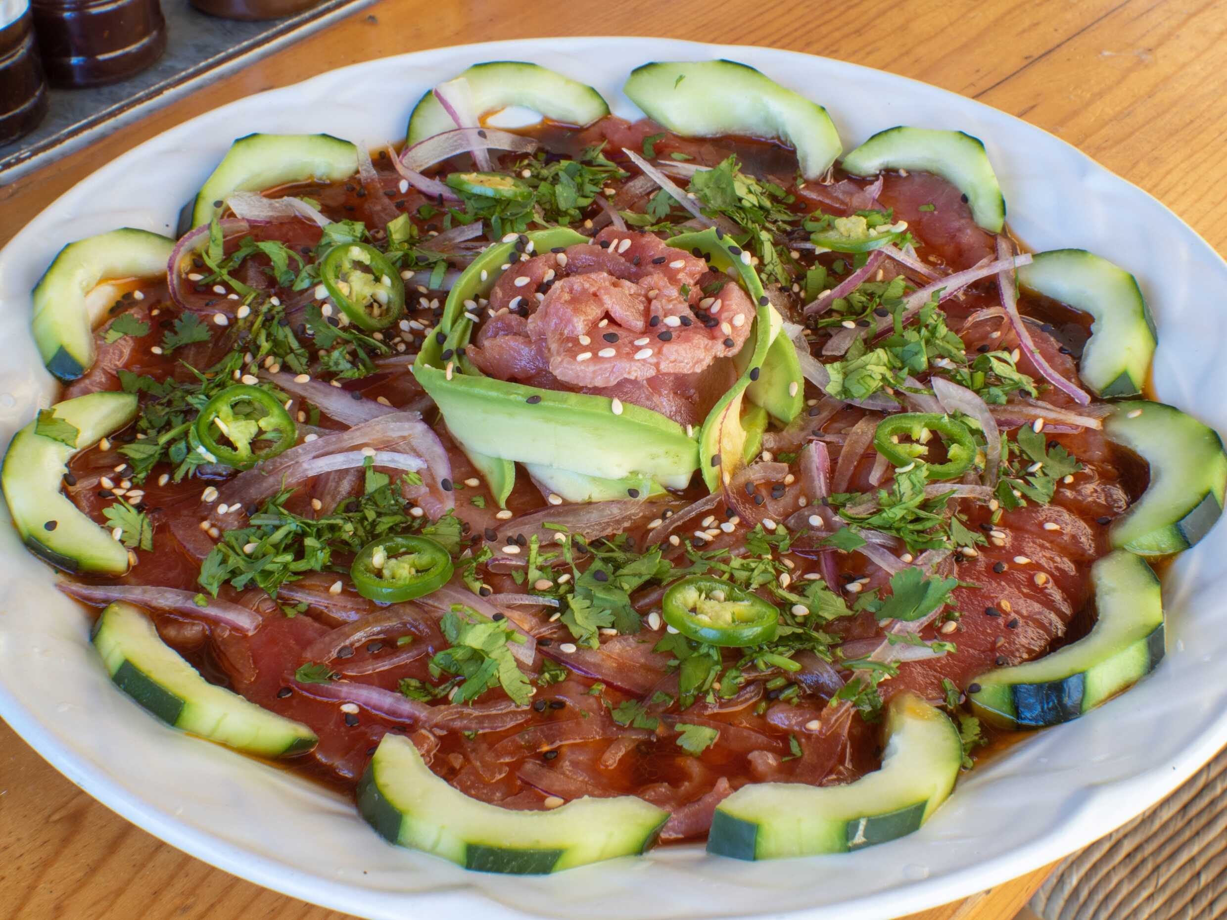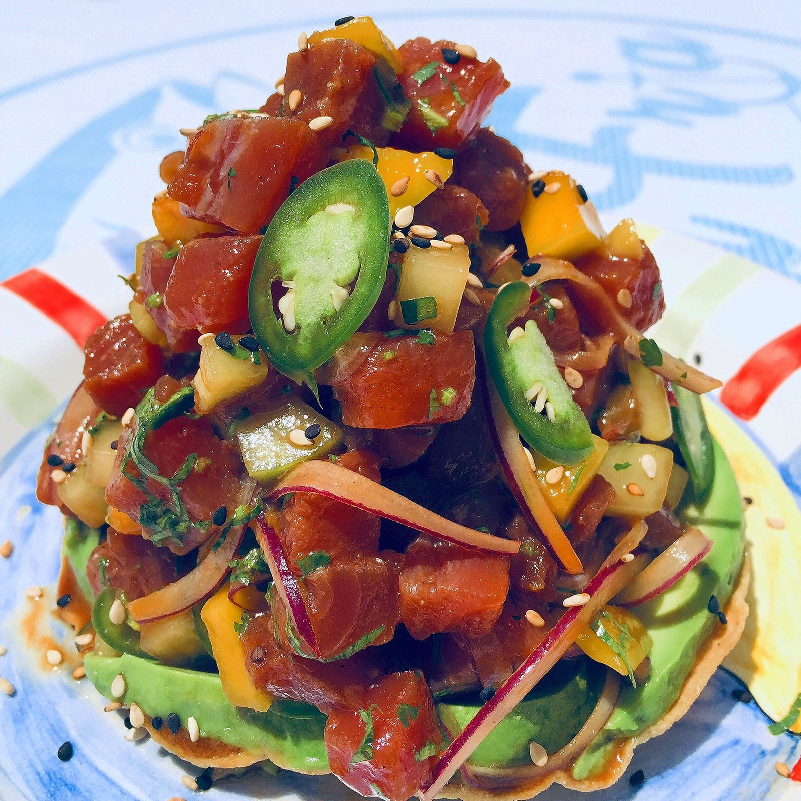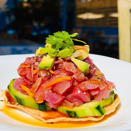 Tuna en cubos, mango, salsa serranito, aguacate, cebolla y rayu.