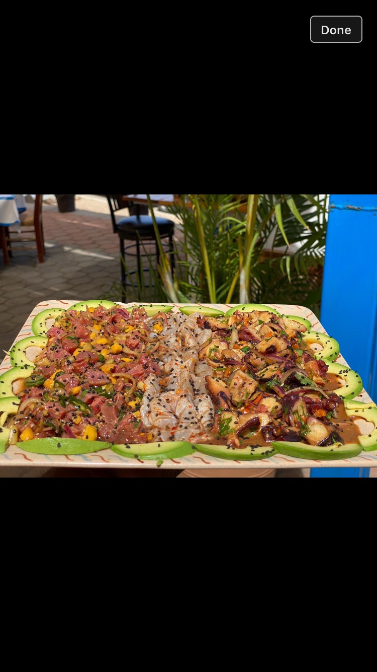 Camarón, aguachile, camarón cocido, tuna, pulpo, mango, aguacate, cebolla, chile y cebolla.
