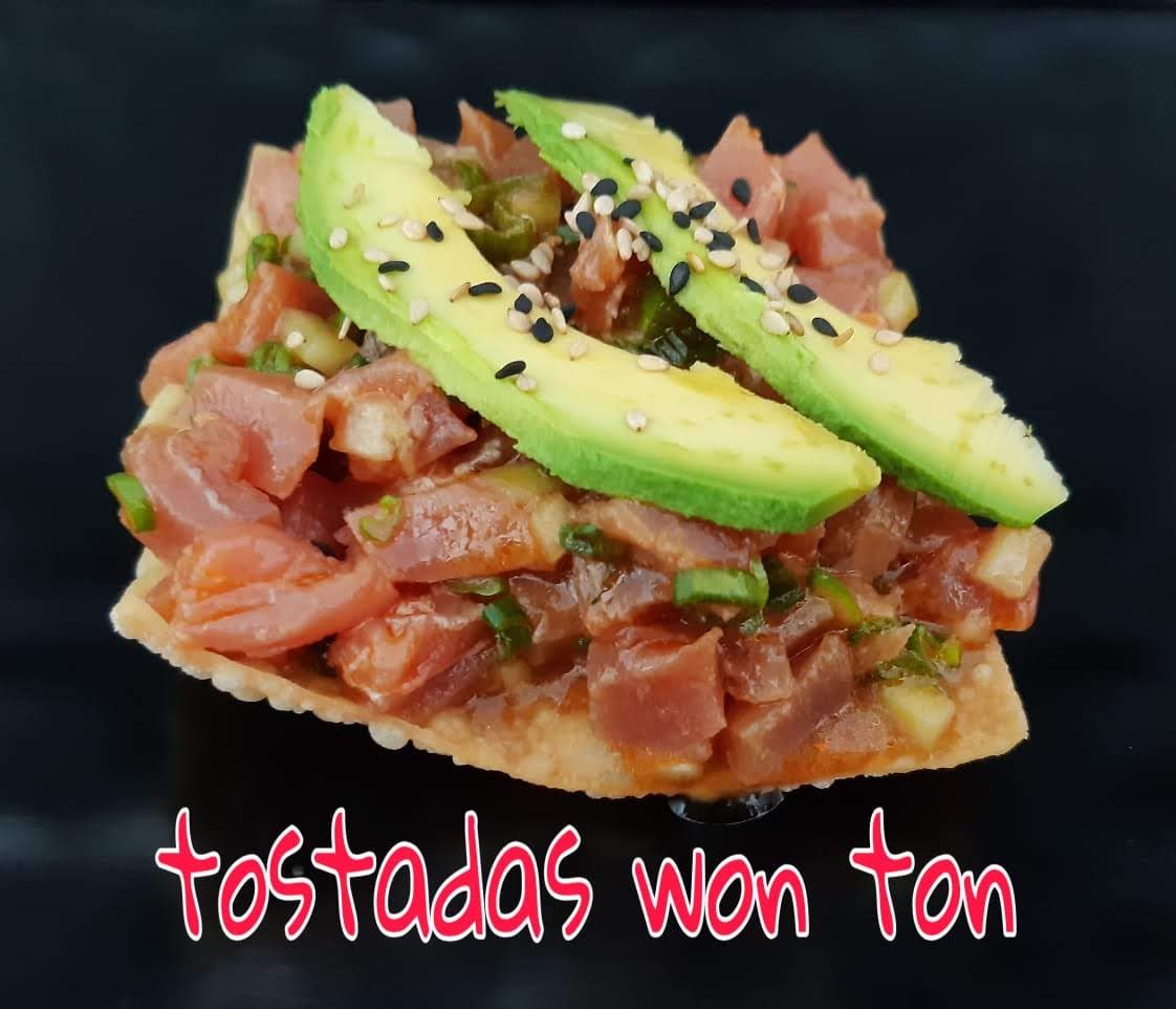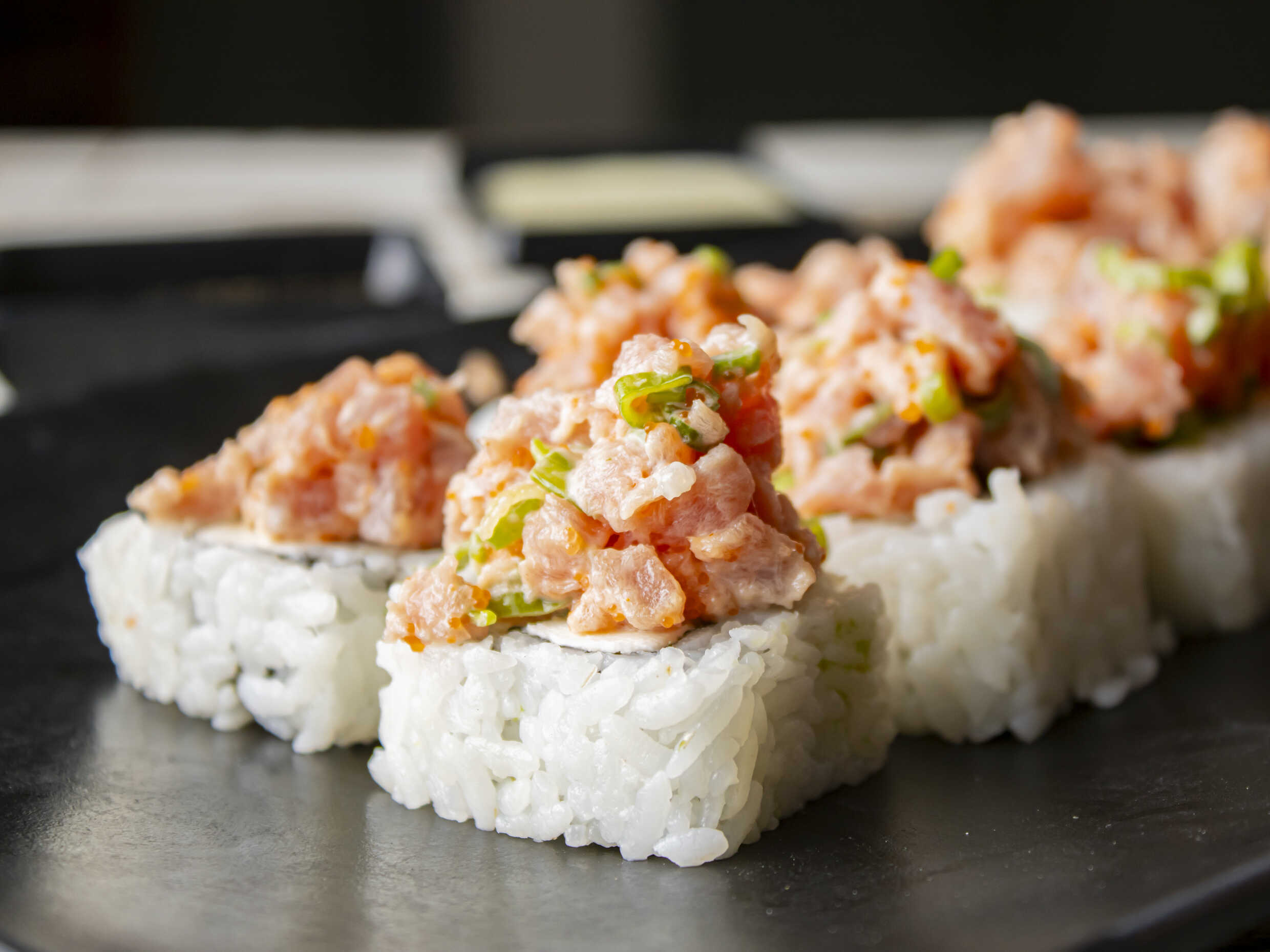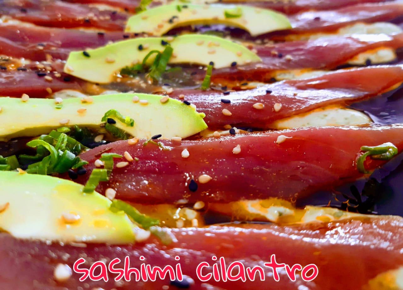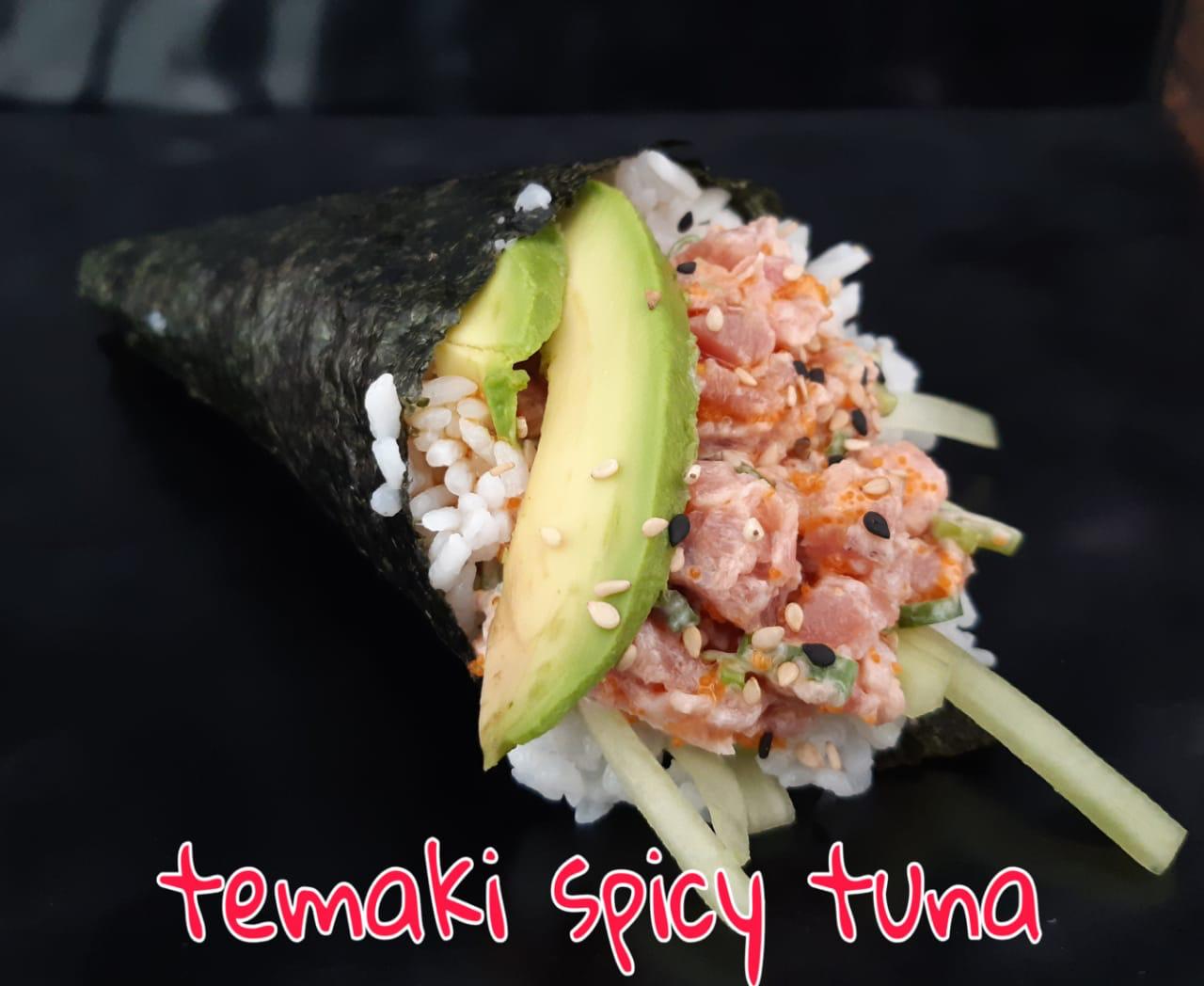 Kanikama, spicy cilantro, atún, masago, aguacate y chile serrano bañado en aceite ra-yu y salsa soya preparada. 390 g.