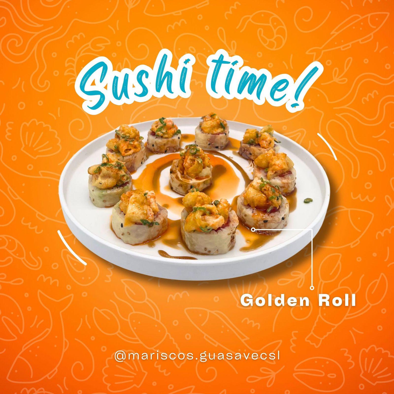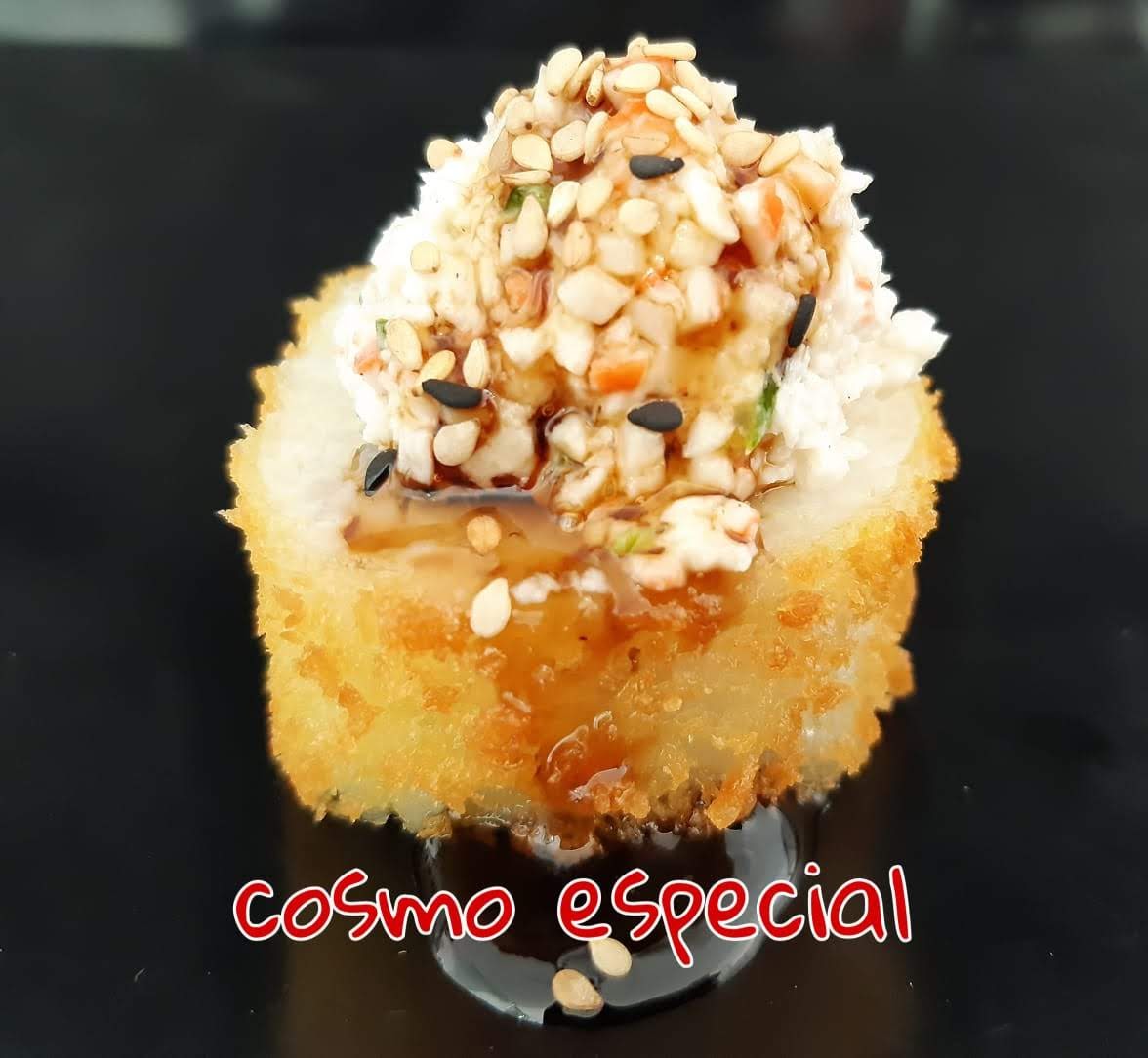 Camarón, queso crema, pepino y aguacate, por fuera atún, salmón, pulpo, camarón, cangrejo y callo bañado en salsa serranito.