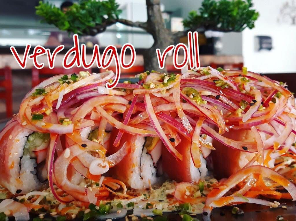 Camarón, kanikama y pepino cubiertos con atún, cebolla morada 590 g chilolla morada serrano sobre una cama de zanahorita y kanikama bañado en una mezcla de limón, sal, ra-yu y salsa serranito sobre un delicioso aderezo cilantro.
