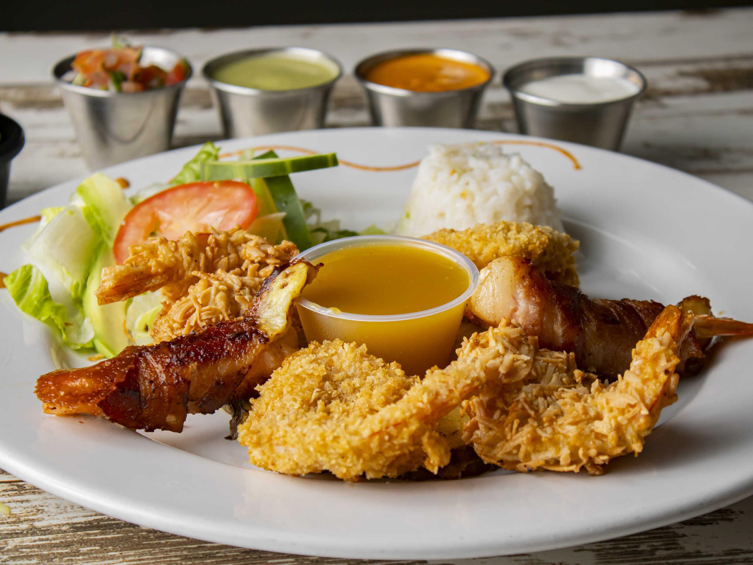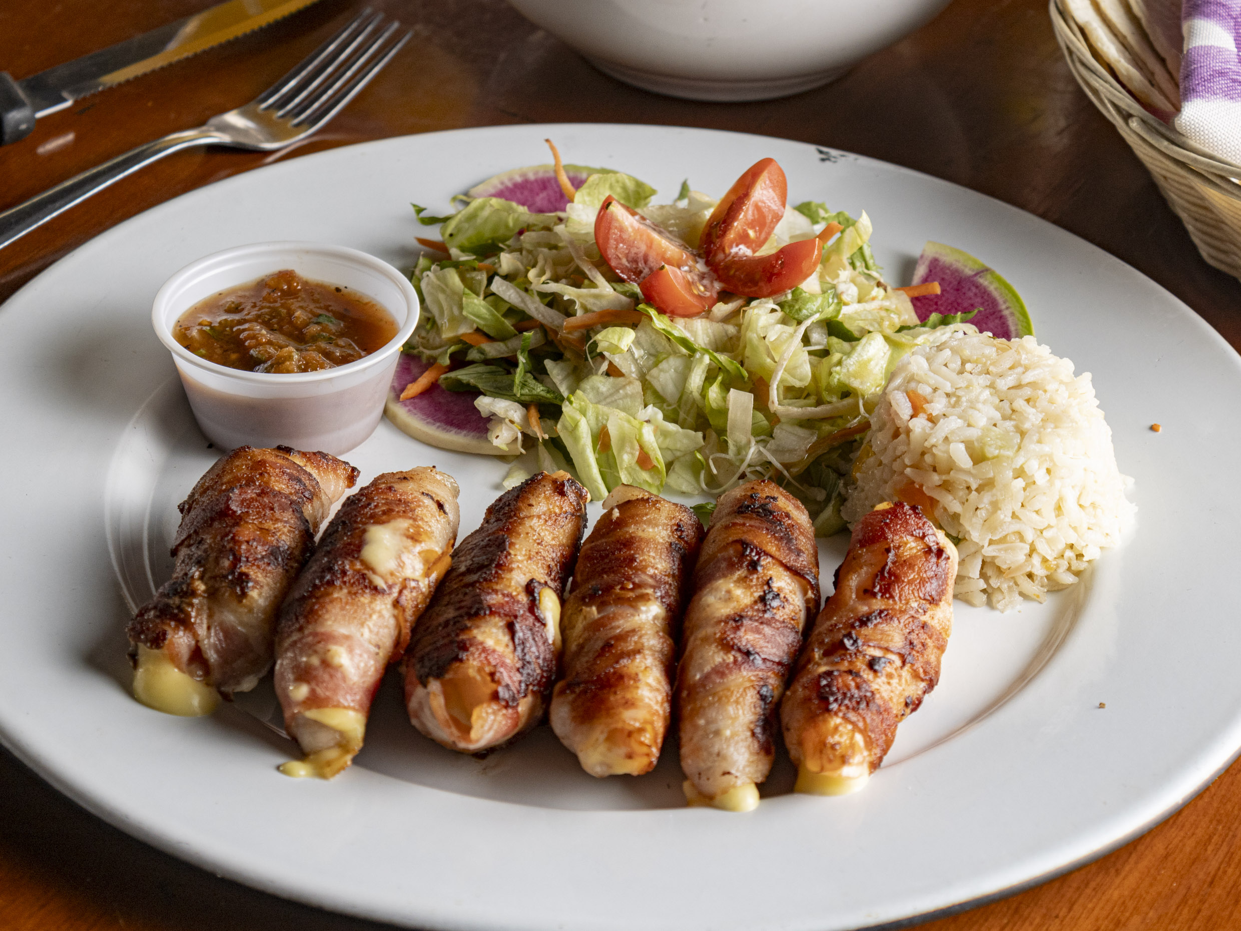 Deliciosos camarones rellenos de queso, envueltos en tocino, acompañados de arroz y ensalada. 180 g.