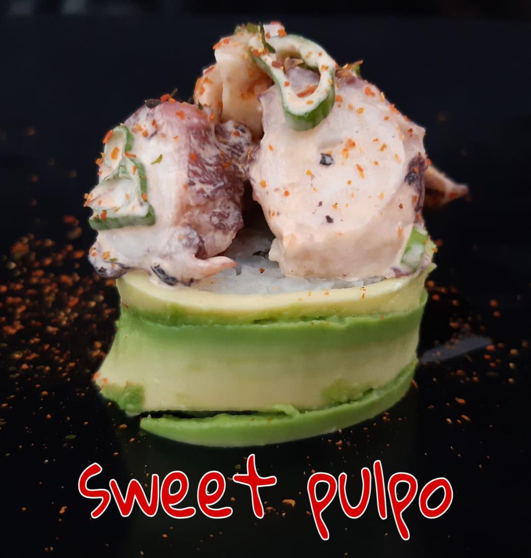 Camarón empanizado, kanikama, queso crema y pepino cubierto de aguacate con topping spicy pulpo bañado en salsa de anguila y togarashi.
