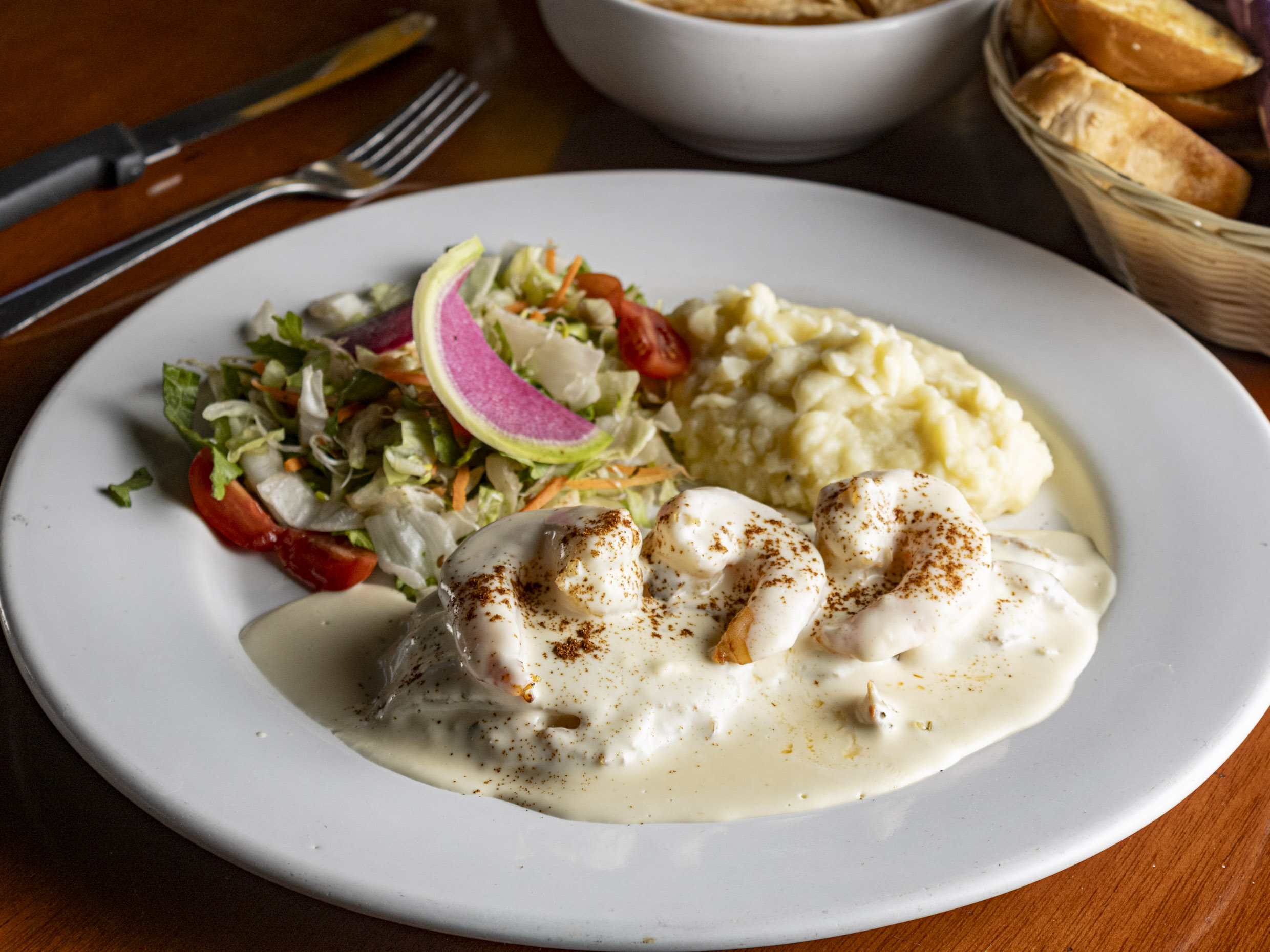 Camarón o pescado en crema de tres quesos, chester, queso crema, parmesano con dos guarniciones, puré de papa y ensalada. 210 g.