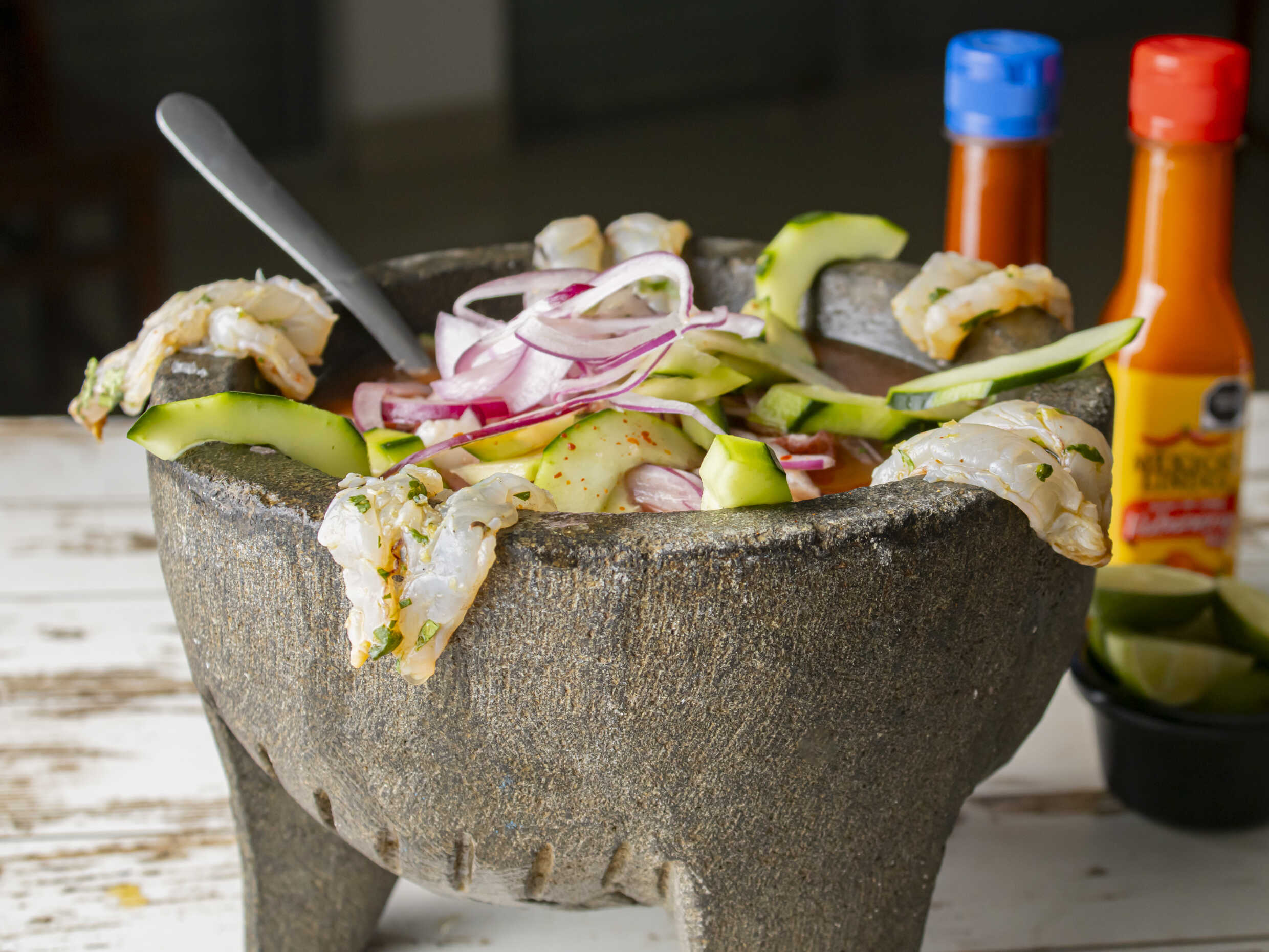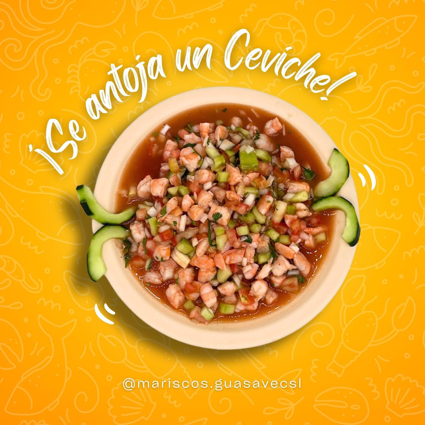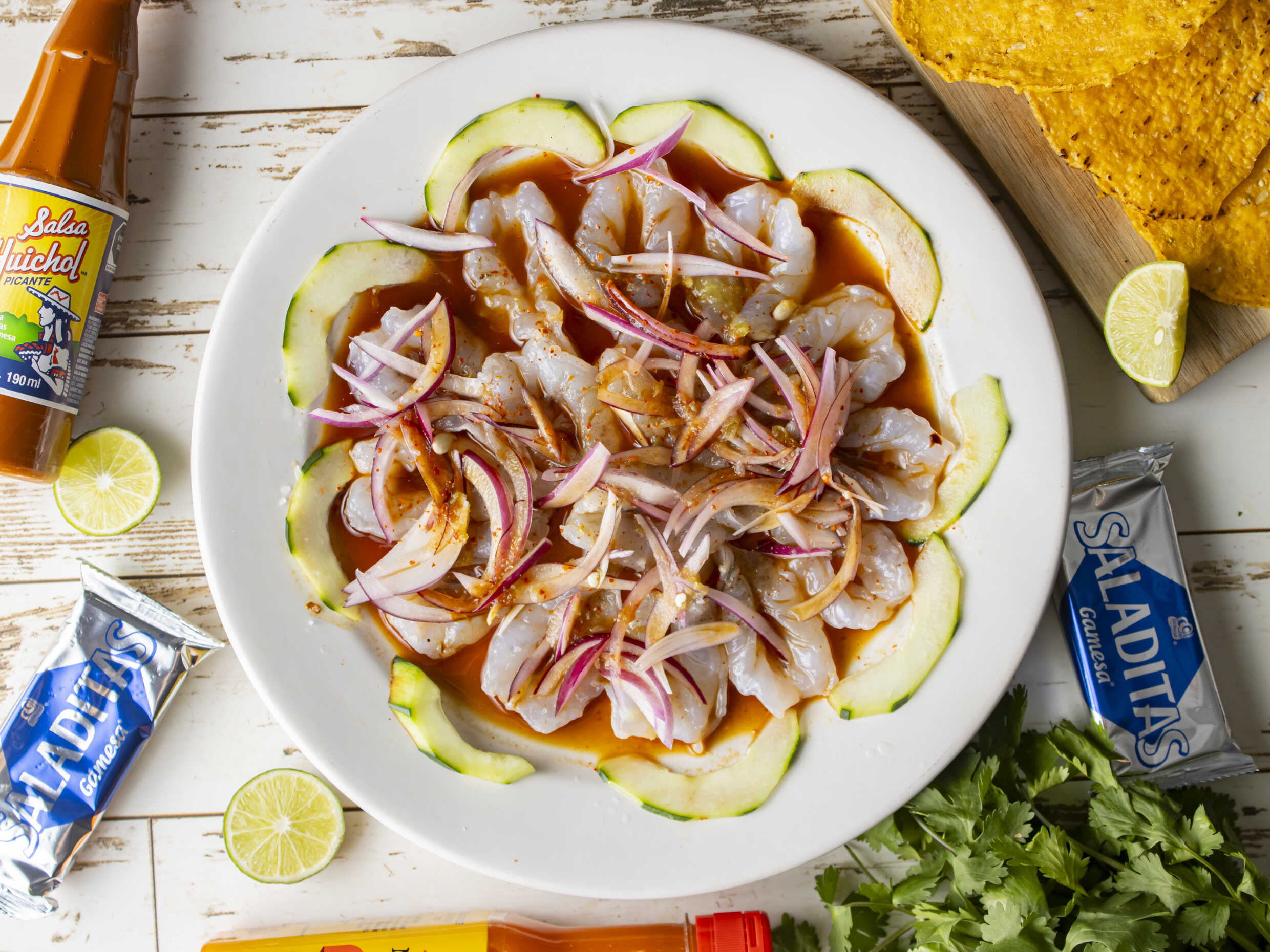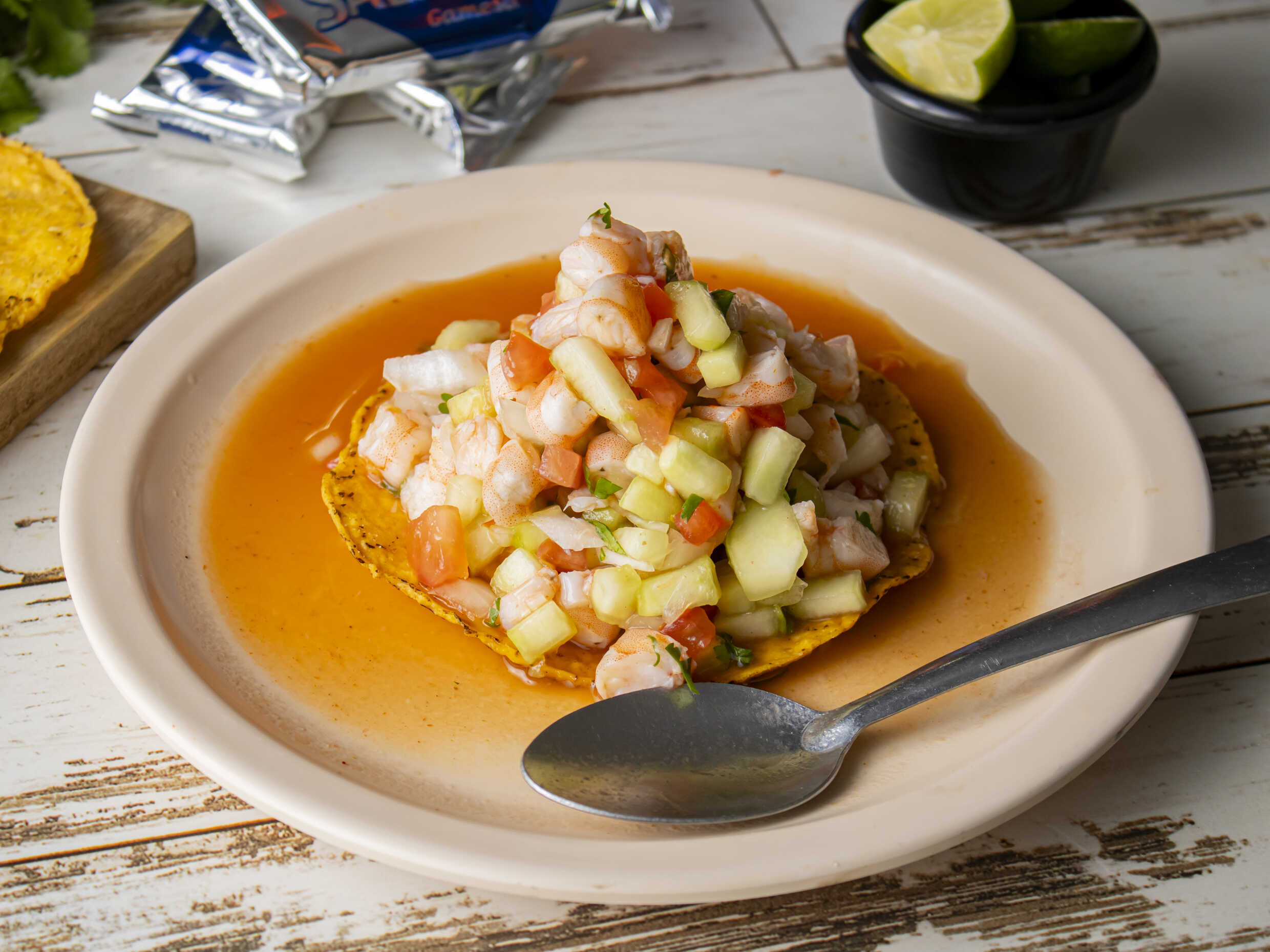 Camarón, cebolla, pepino, tomate y cilantro. 70 g.