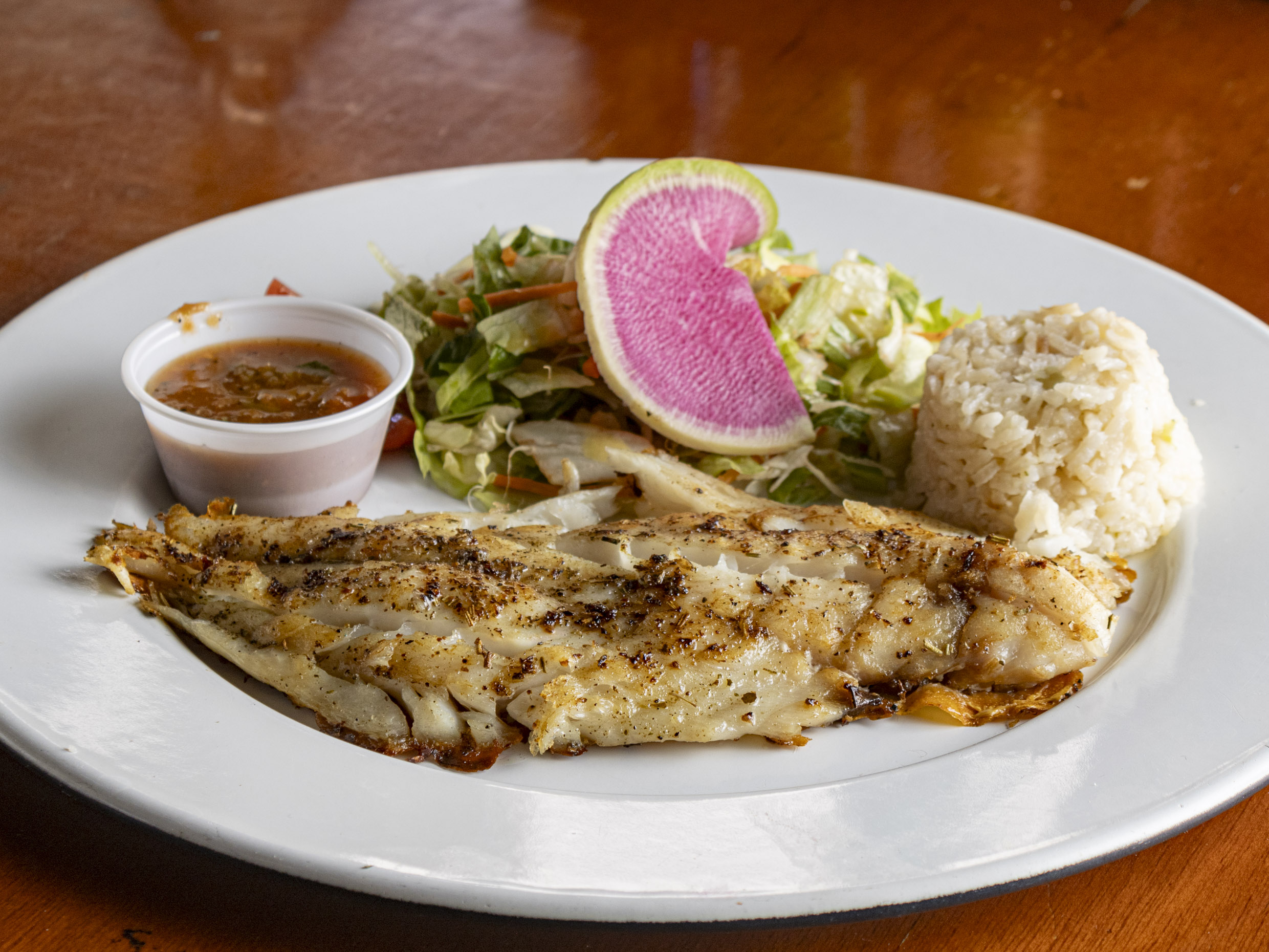 Filete de pescado o camarón a la plancha, salpimentados, acompañados de arroz y ensalada. Pescado 210 g o camarón 180 g.