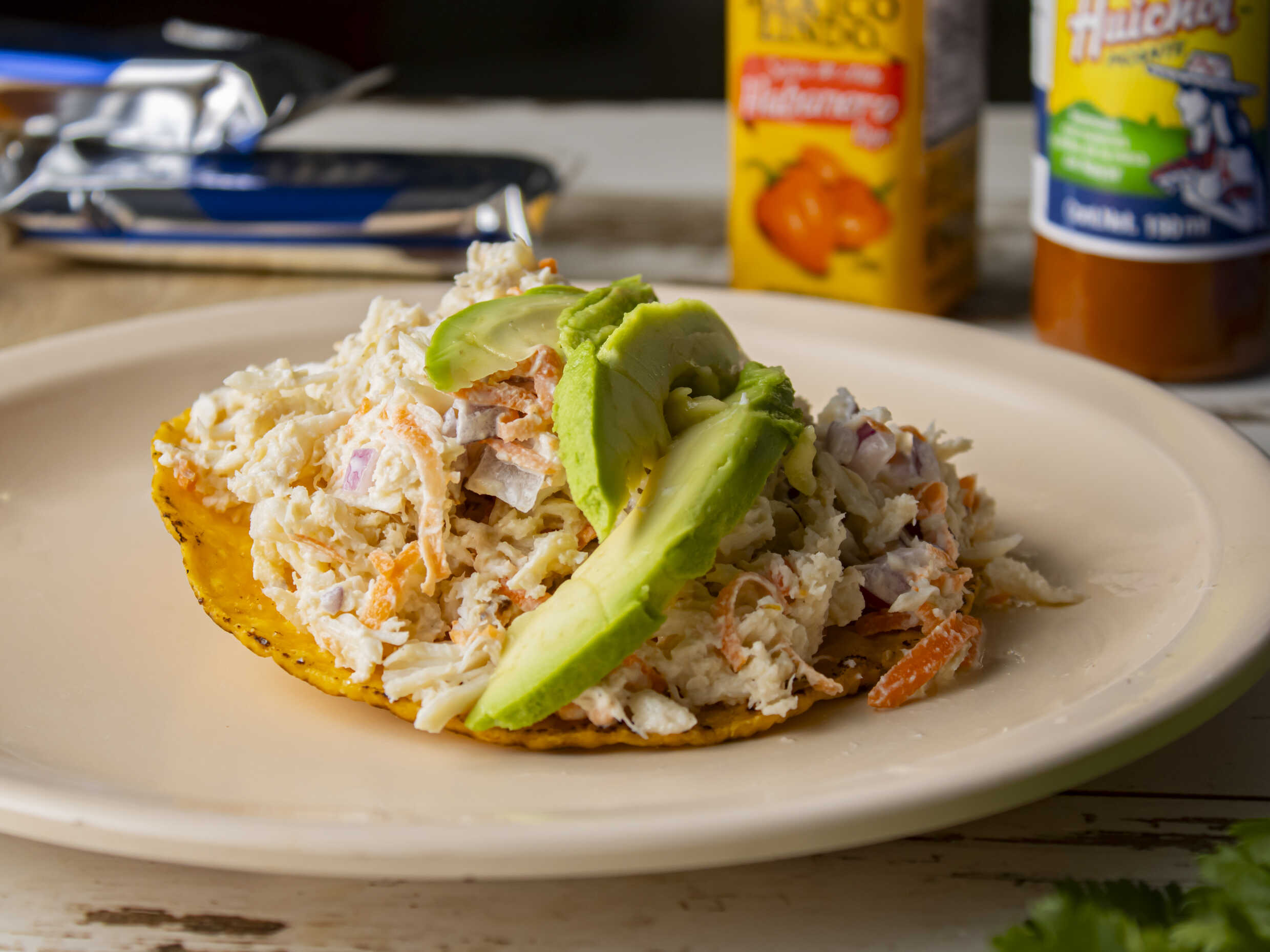 Mezcla de jaiba con mayonesa, zanahoria, aguacate y cebolla. 60 g.
