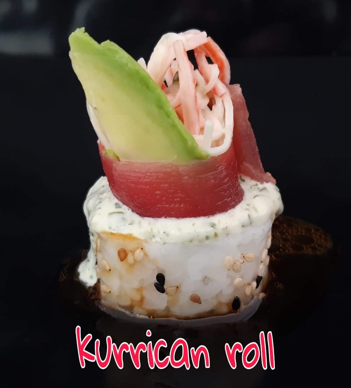 Camarón, aguacate y pepino cubierto en papel de arroz con topping de kurrican bañado en aderezo cilantro y salsa serranito. 405 g.