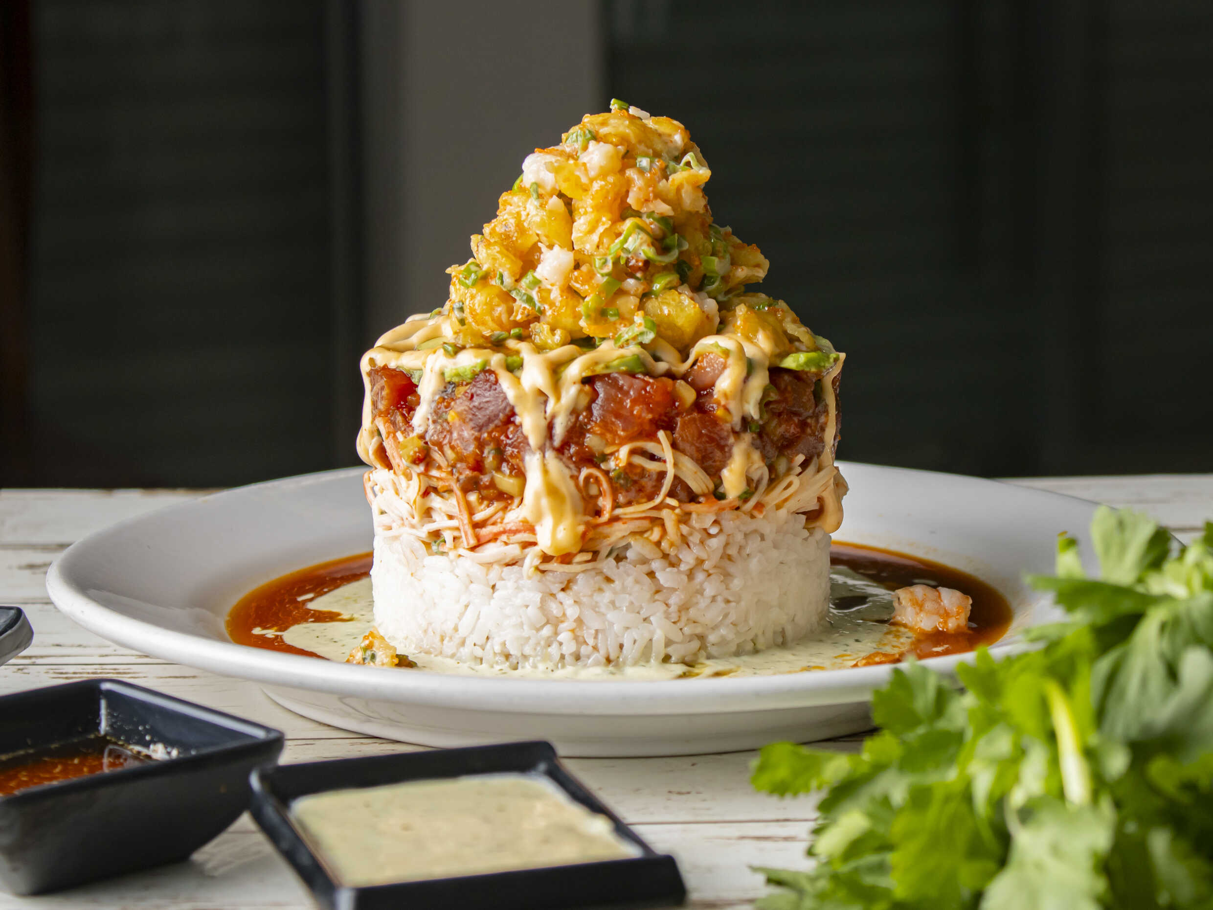 2 Personas. Arroz, spicy de cangrejo, mix de atún, mango, pepino, masago y limón real en una salsa especial sobre un espejo de aderezo cilantro, salsa serranito. Coronado con aguacate y camarón tempura spicy bañado en aderezo spicy y salsa de anguila. 840 g.