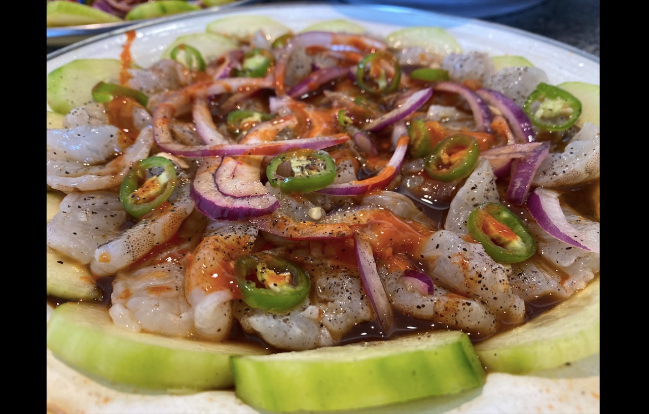 Atún, callo de hacha (solo por temporada) pulpo, lobina, ceviche de camarón crudo y camarón cocido entero con un salseado especial.
