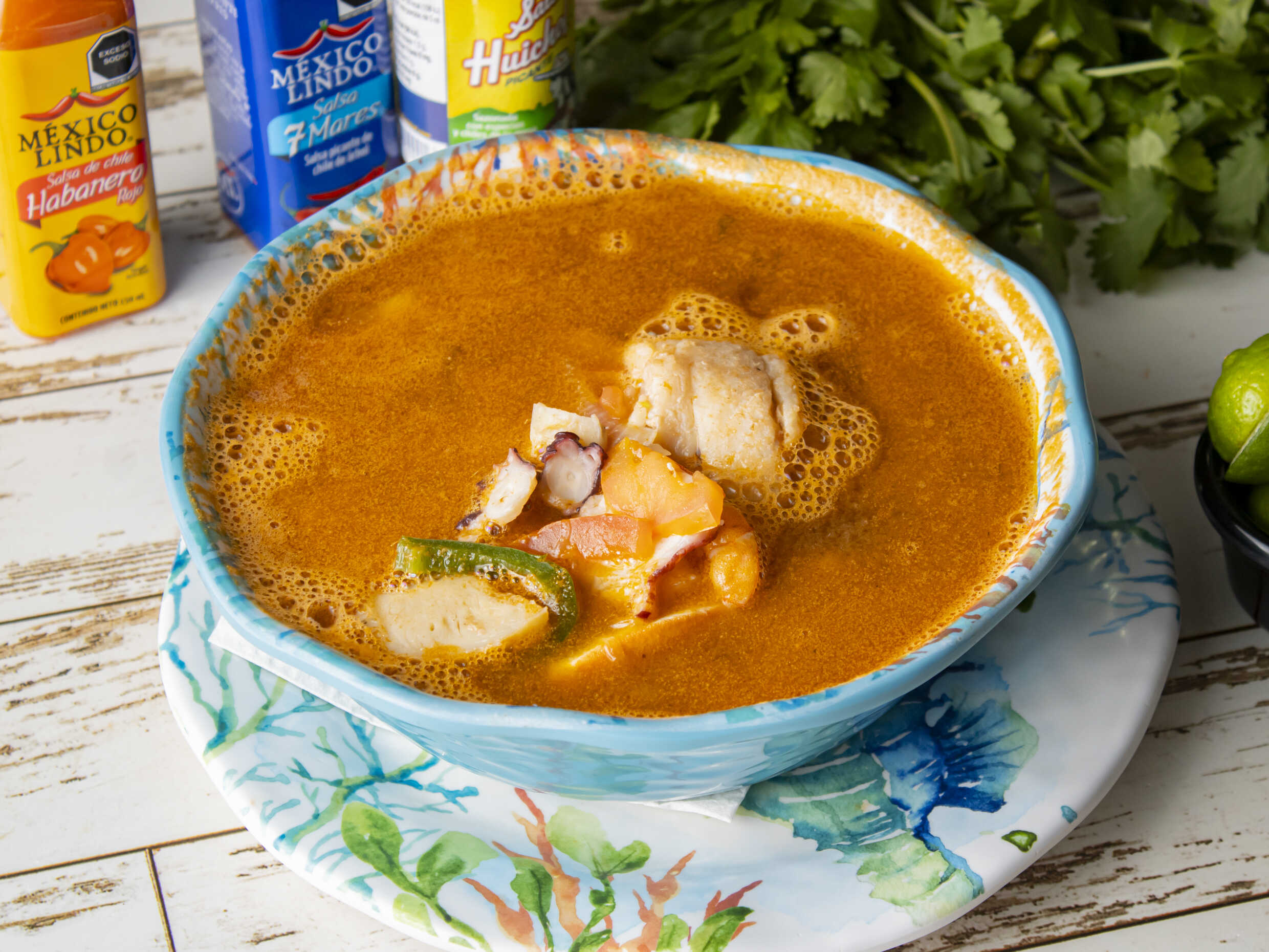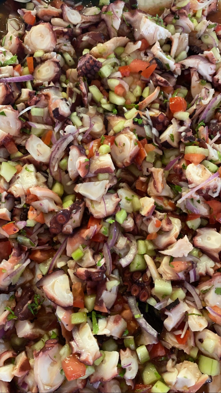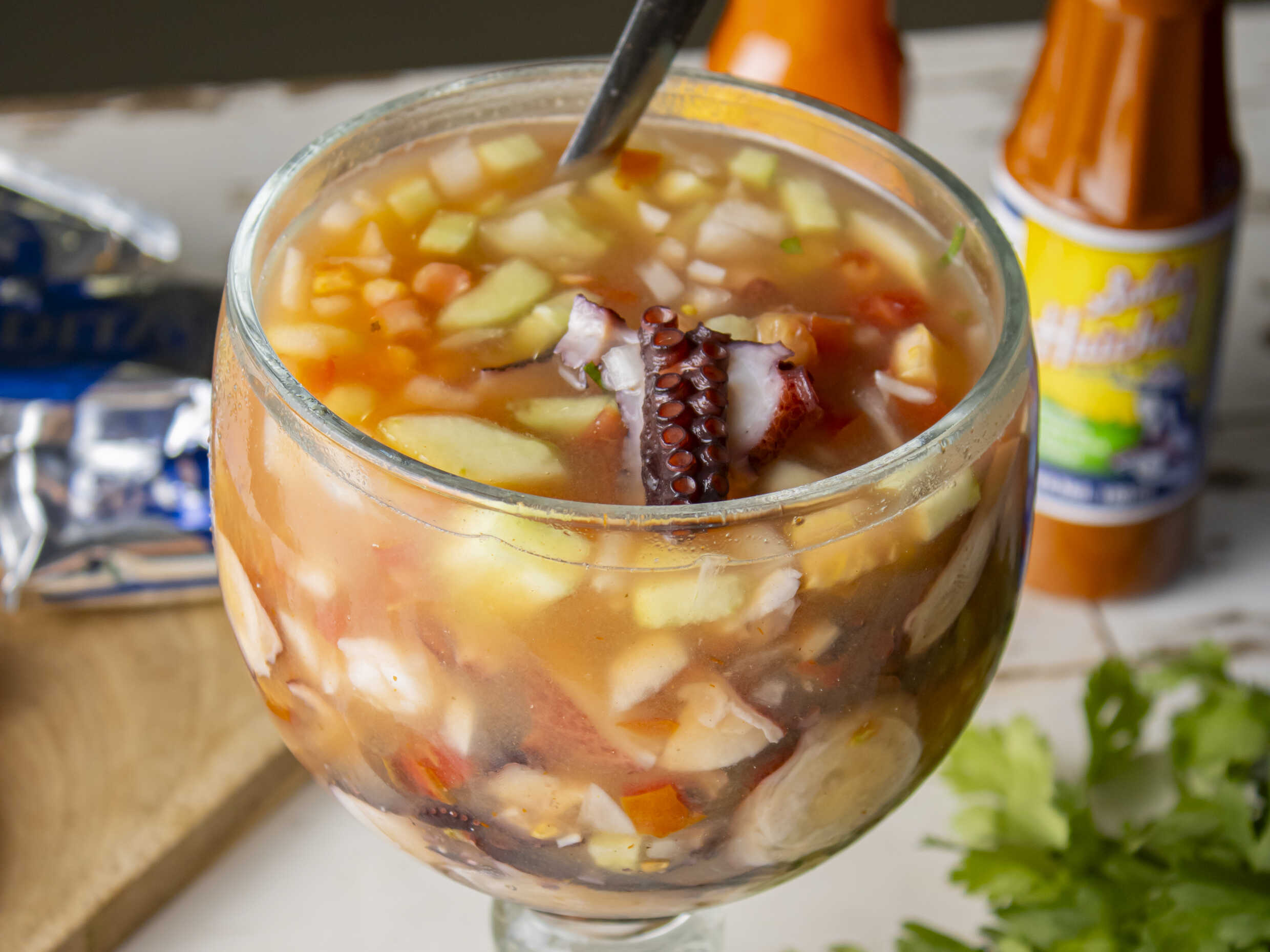 Pulpo, cebolla, pepino, cilantro y clamato. 76 g.