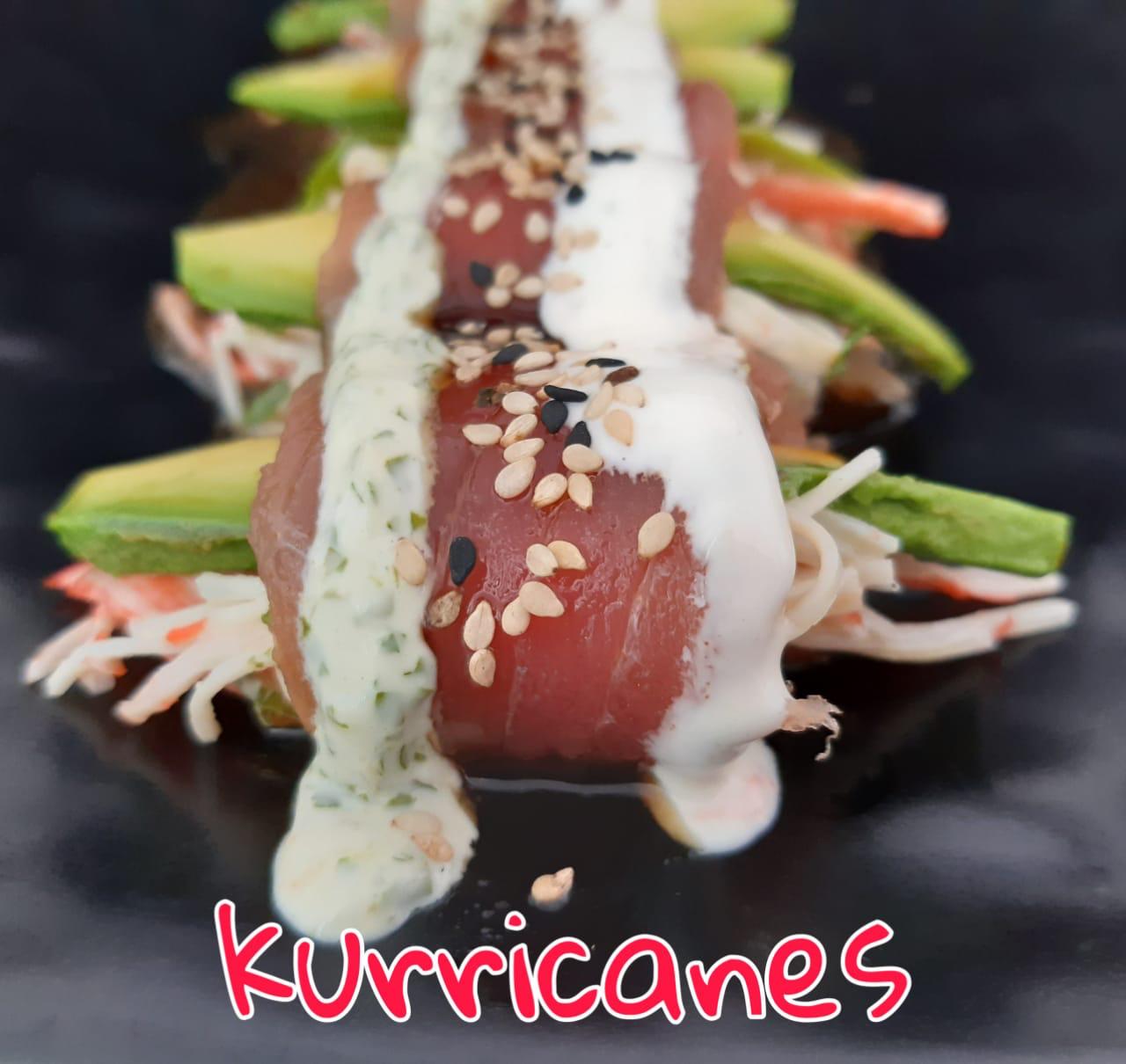 Spicy kanikama y aguacate envueltos en atún con aderezo cilantro, yuzu, salsa de anguila y serranito. 295 g.