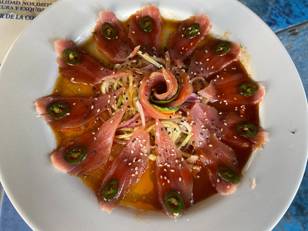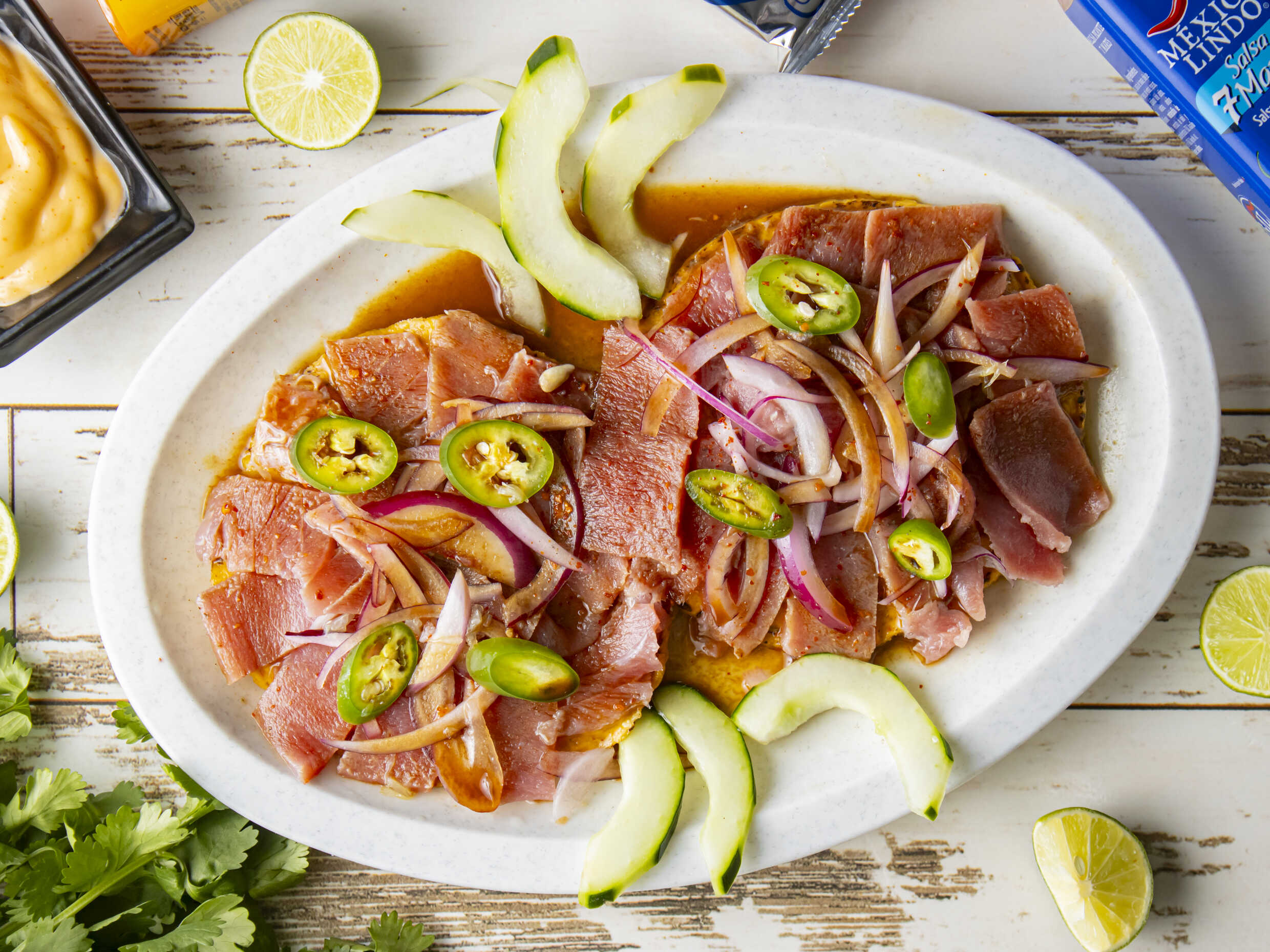 Atún fresco sobre una cama de pepino con chile serrano y salsa serranito. 205 g.