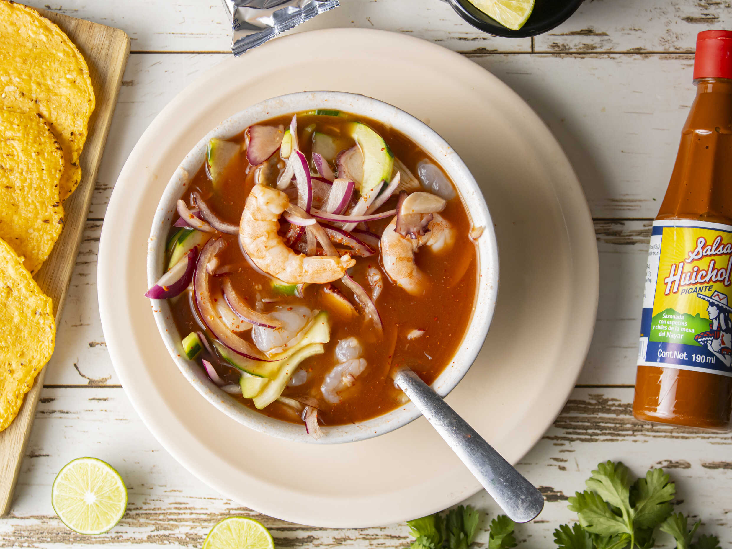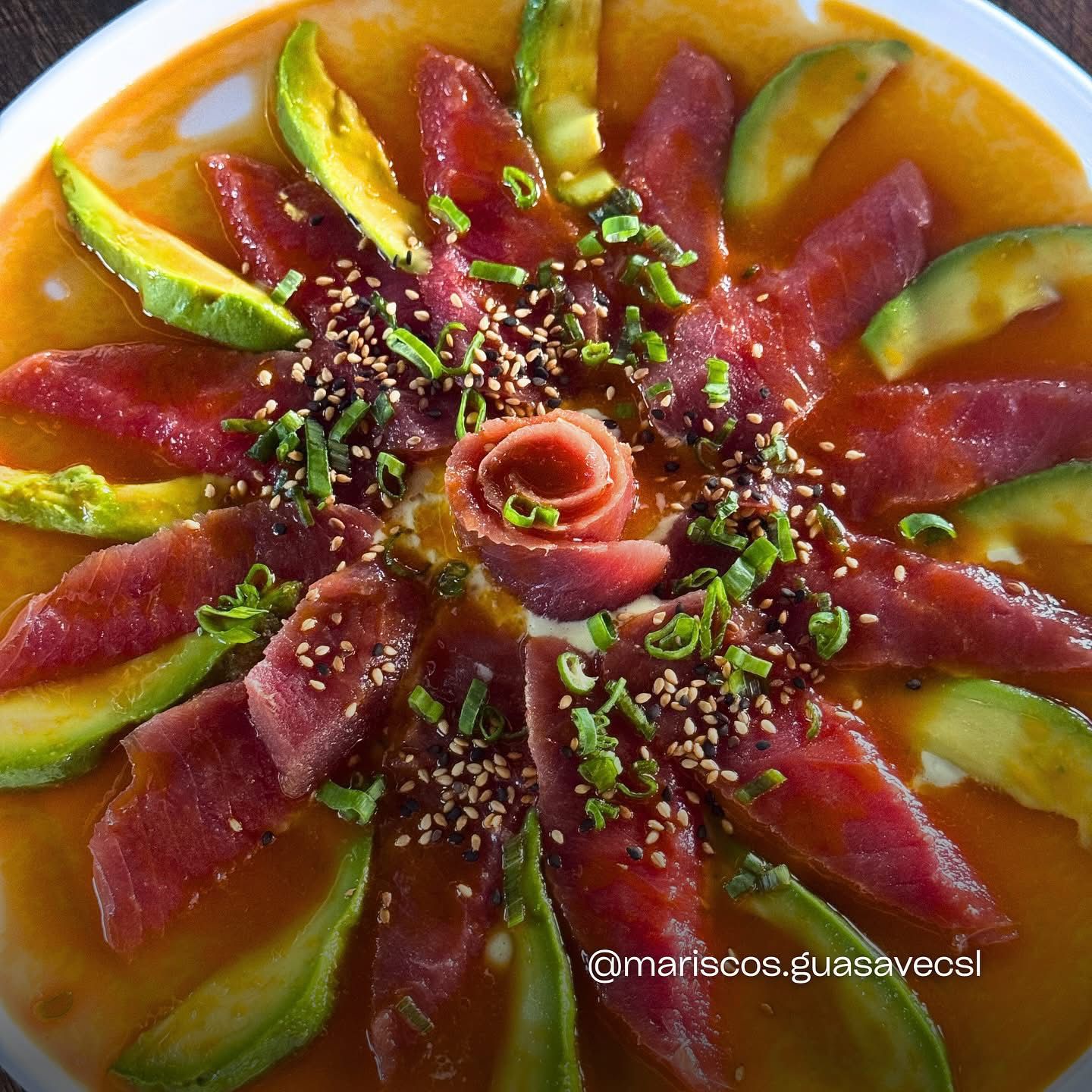 Atún fresco, camarón crudo, camarón cocido, almeja, callos, cebolla morada, aguacate, limón, sa y aceite de ajonjolí picoso, sobre una cama de pepino con salsa serranito. 415 g.