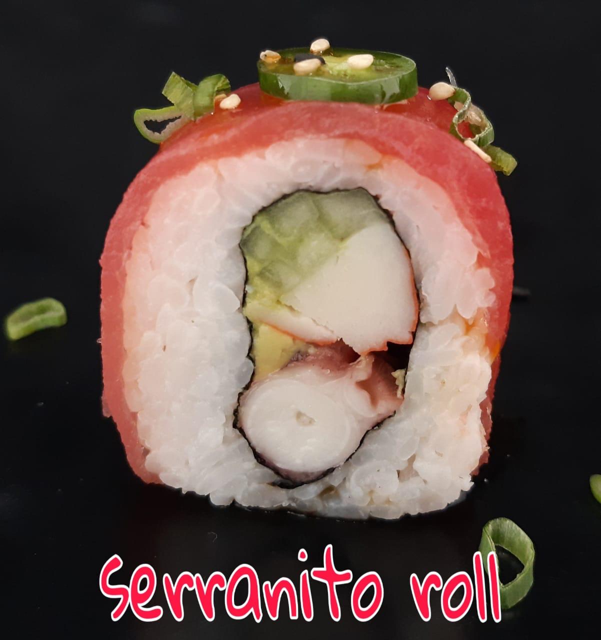 Pulpo, cangrejo, pepino y aguacate forrado de atún, rodajas de chile serranito y salsa serranito.