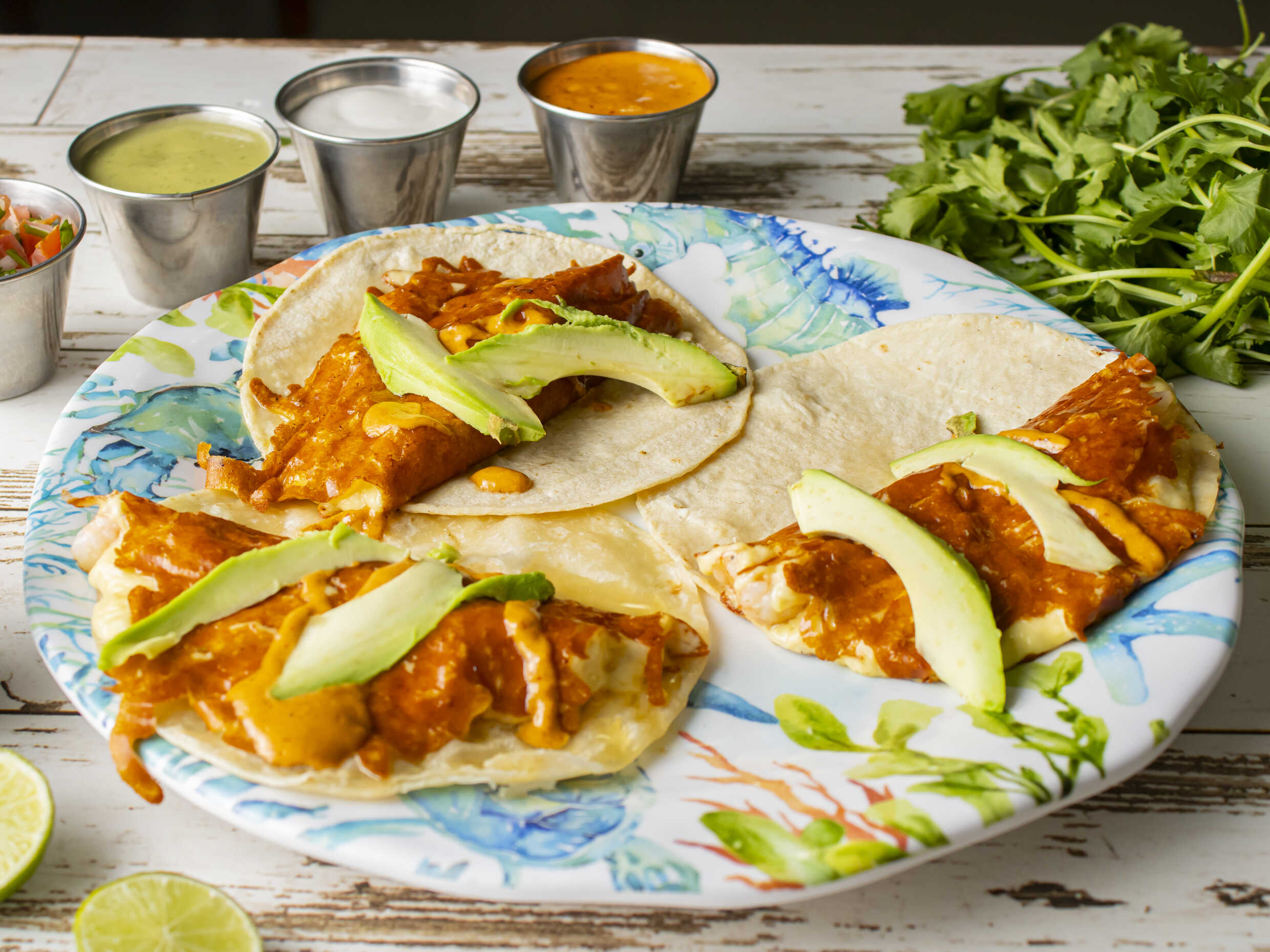 Costra de queso con camarón, aguacate y aderezo spicy chipotle. 60 g.
