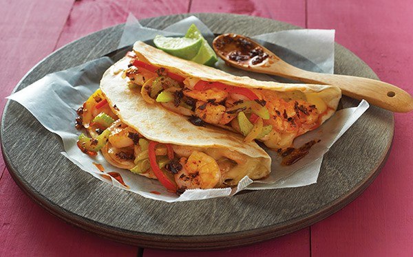 Quesadilla de camarón mezclado con cebolla, tomate y chile morrón. 90 g pza.