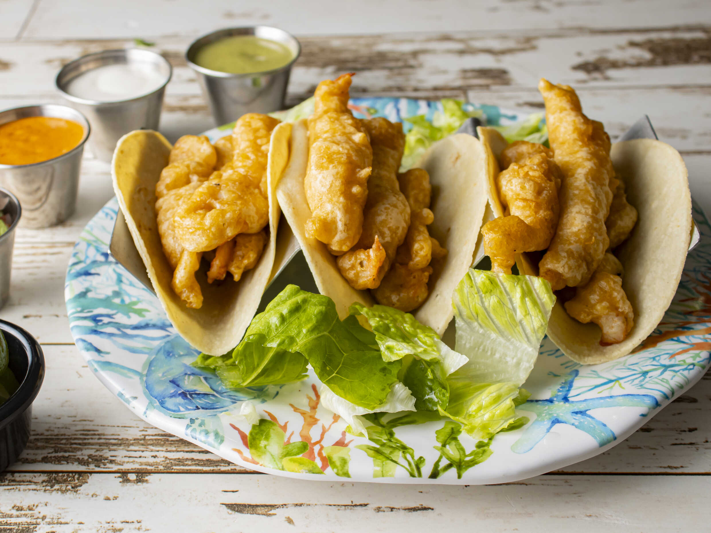 Camarón o pescado empanizado, acompañado de arroz y ensalada. Pescado 210 g o camarón 180 g.