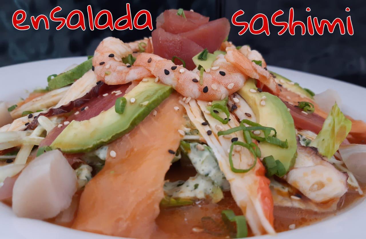 Cama de lechuga, zanahoria y pepino con salmón, atún, surimo, kanikama, camarón, pulpo y callo preparados con diferentes salsas.