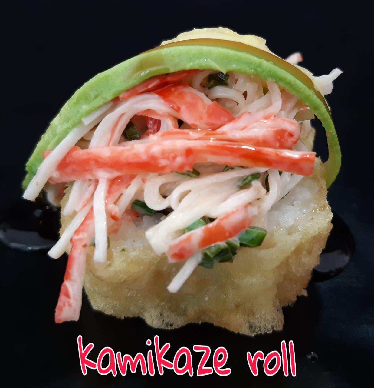 Atún, spicy crabj, chile toreado, limón real, aguacate y pepino cubierto con papel de soja con topping de camarón spicy tempura, bañado en salsa de anguila y ra-yu.