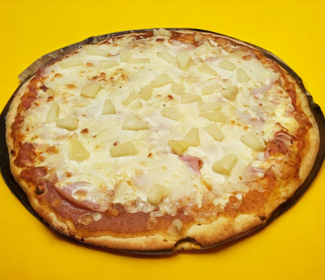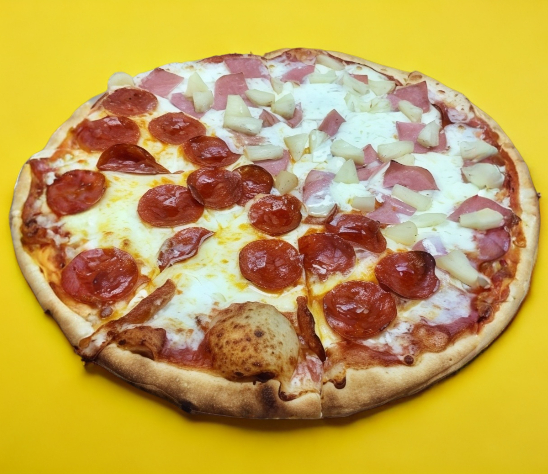 Pizza tradicional mitad Peperoni mitad jamon con piña