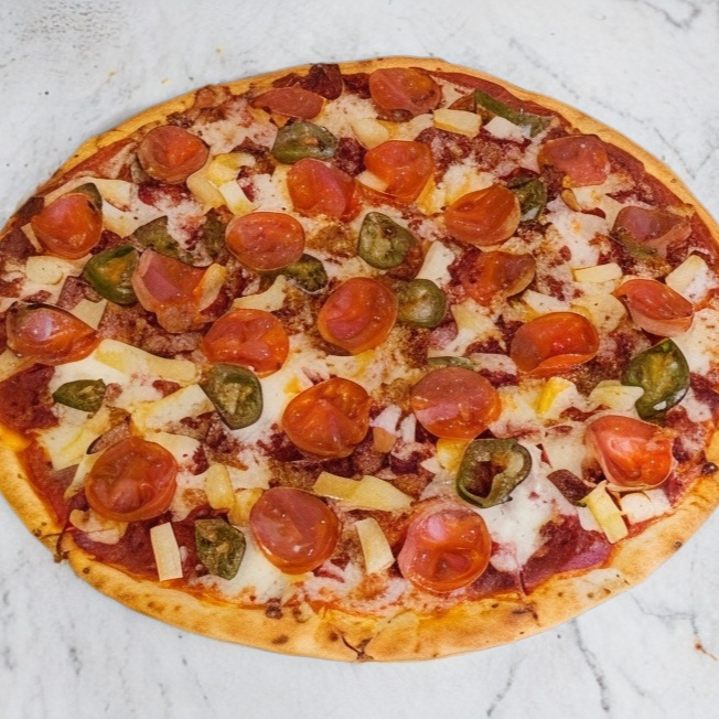 Deliciosa pizza con chorizo, piña, tocino, jalapeño y pepperoni.