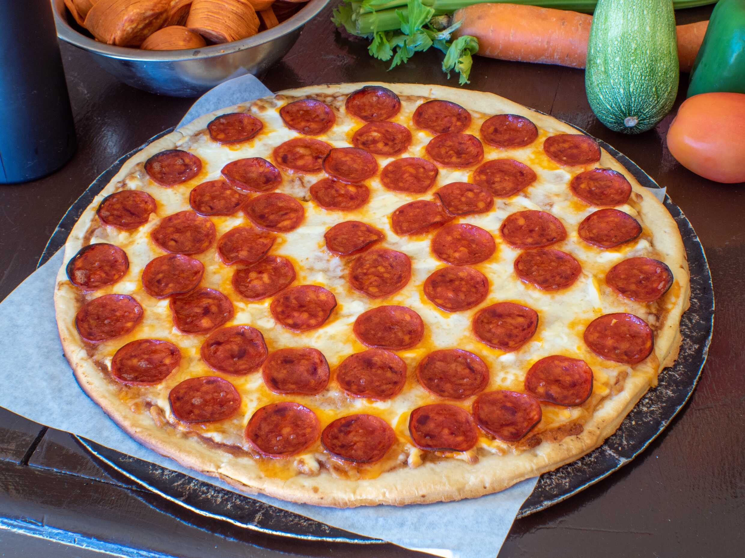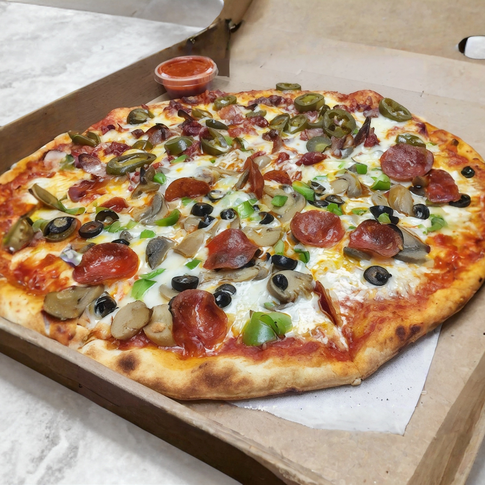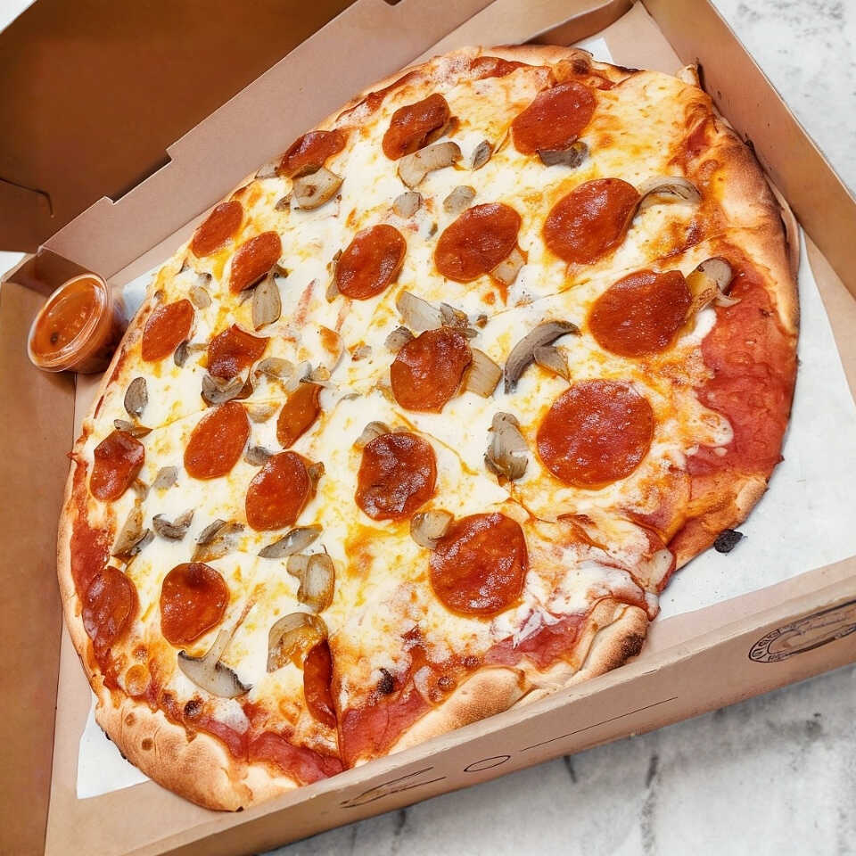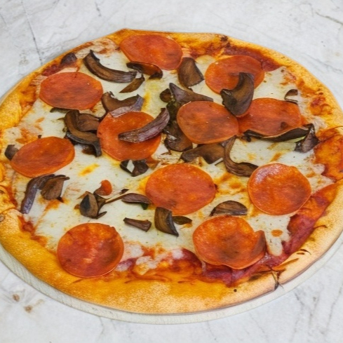 Deliciosa pizza con champiñones, aceituna, morrón y pepperoni.