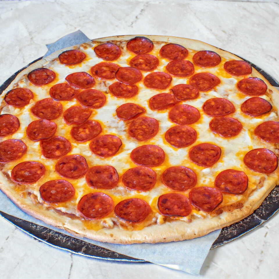 Pizza tradicional con la mejor mezcla de quesos mozarella y monterrey jack, preparada con nuestra exquisita salsa de tomate.