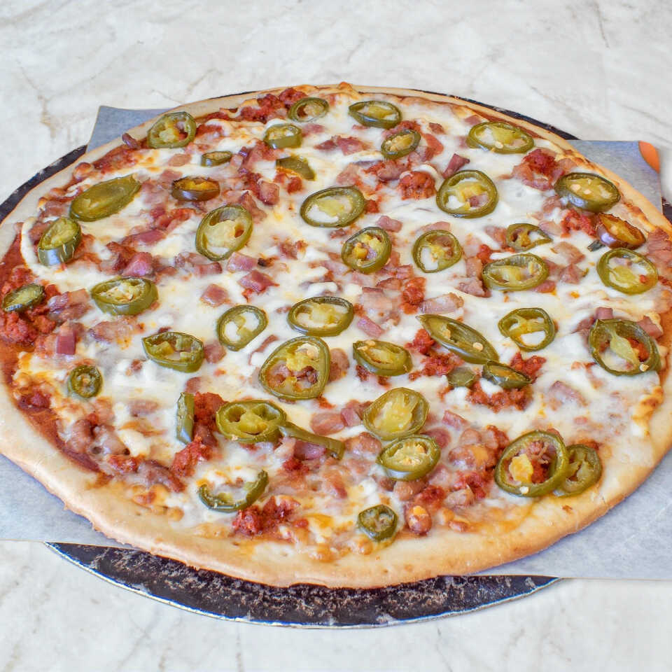 Deliciosa pizza con chorizo, frijol, tocino y jalapeño.