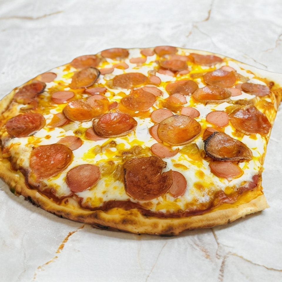 Deliciosa pizza con pepperoni, jamón, salchicha y tocino.