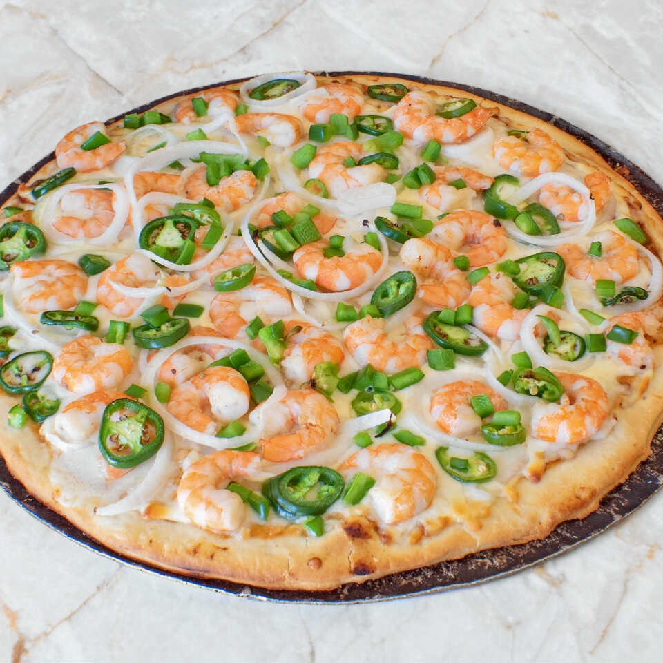 Pizza grande de camarón con chile serrano, cebolla blanca y pimiento verde.