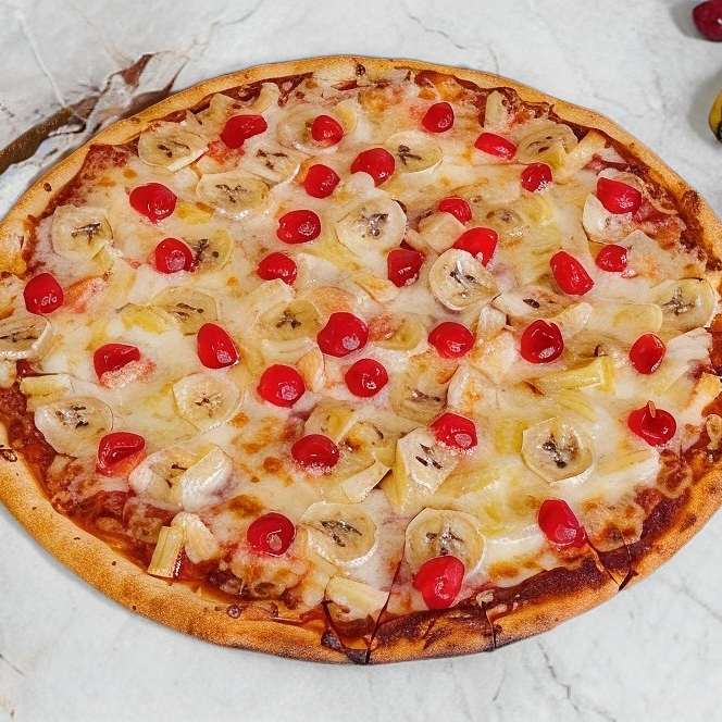 Deliciosa pizza con jamón, piña, cereza y plátano.
