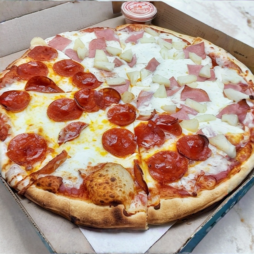 Pizza grande (14") mitad pepperoni y mitad jamón con piña (incluye refresco de 1.5L).