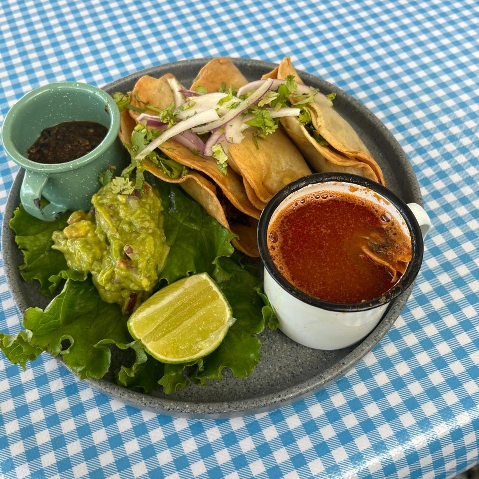 Acompañada con tortillas de maíz hechas a mano, cebolla morada y chile serrano.