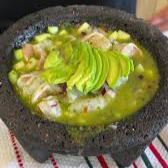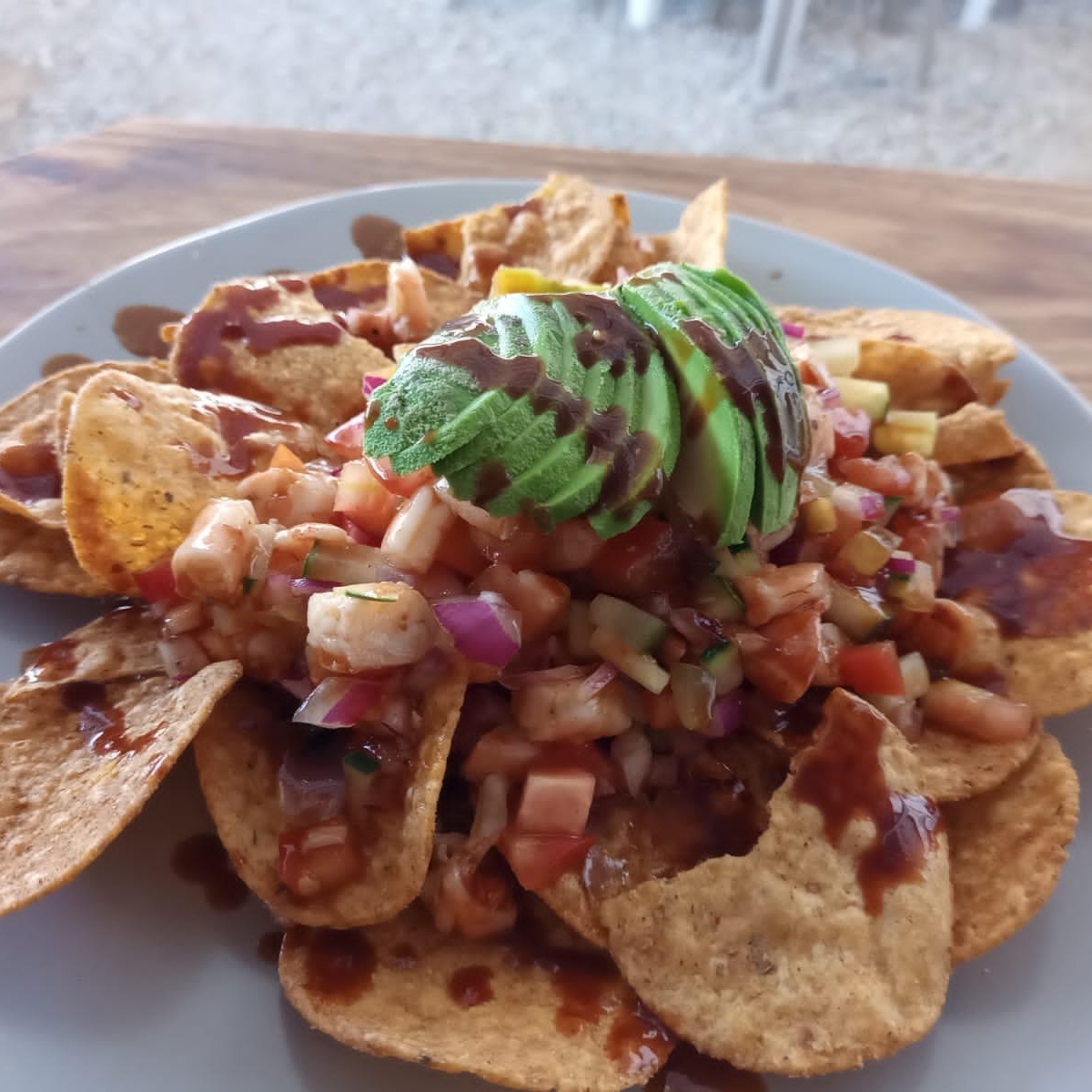 Ceviche a elegir (camarón o pescado), sobre una cama de tostitos verdes o morados, decorado con aguacate y salsa de casa.