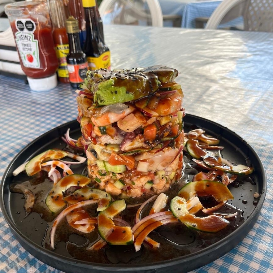 Cama de ceviche de pescado, camarón cocido y crudo, pulpo, callo, caracol, clamato, jugo de camarón, salsa negra, pepino, cebolla morada, tomate.
