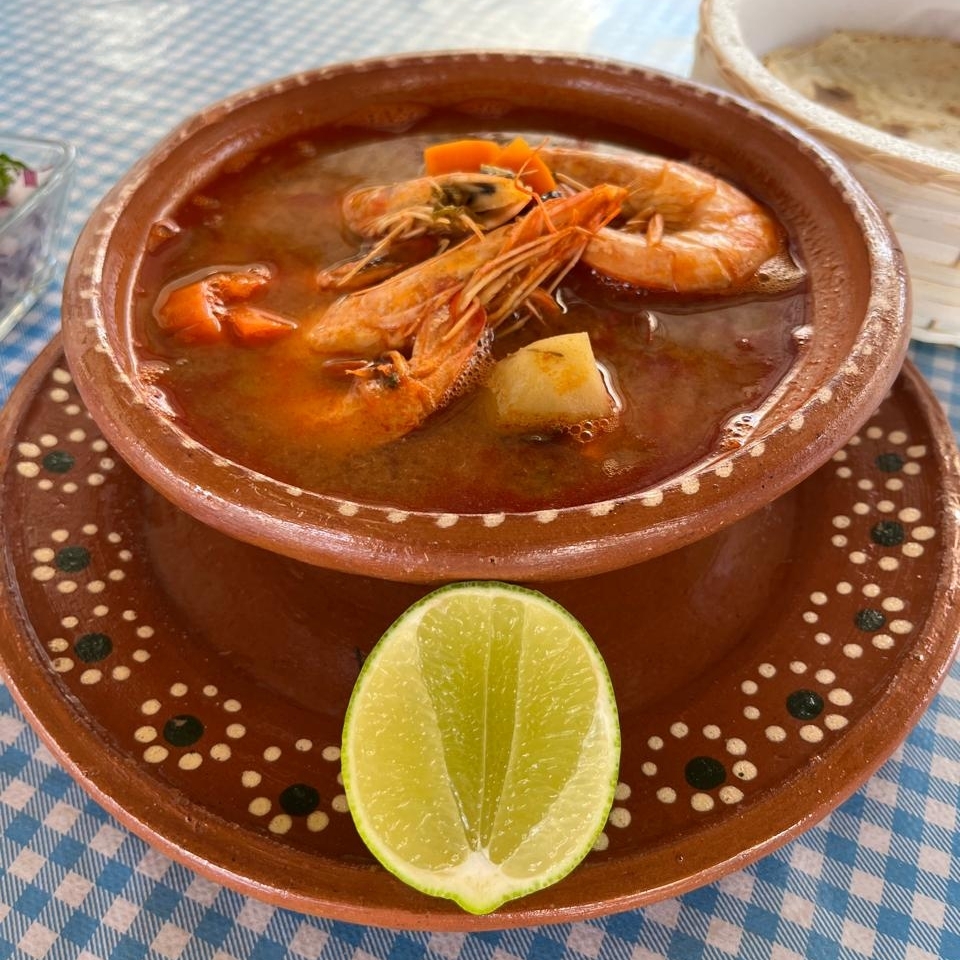 Caldo de mariscos, acompañado con tortilñas de maíz hechas a mano, cebolla y chiñe serrano.