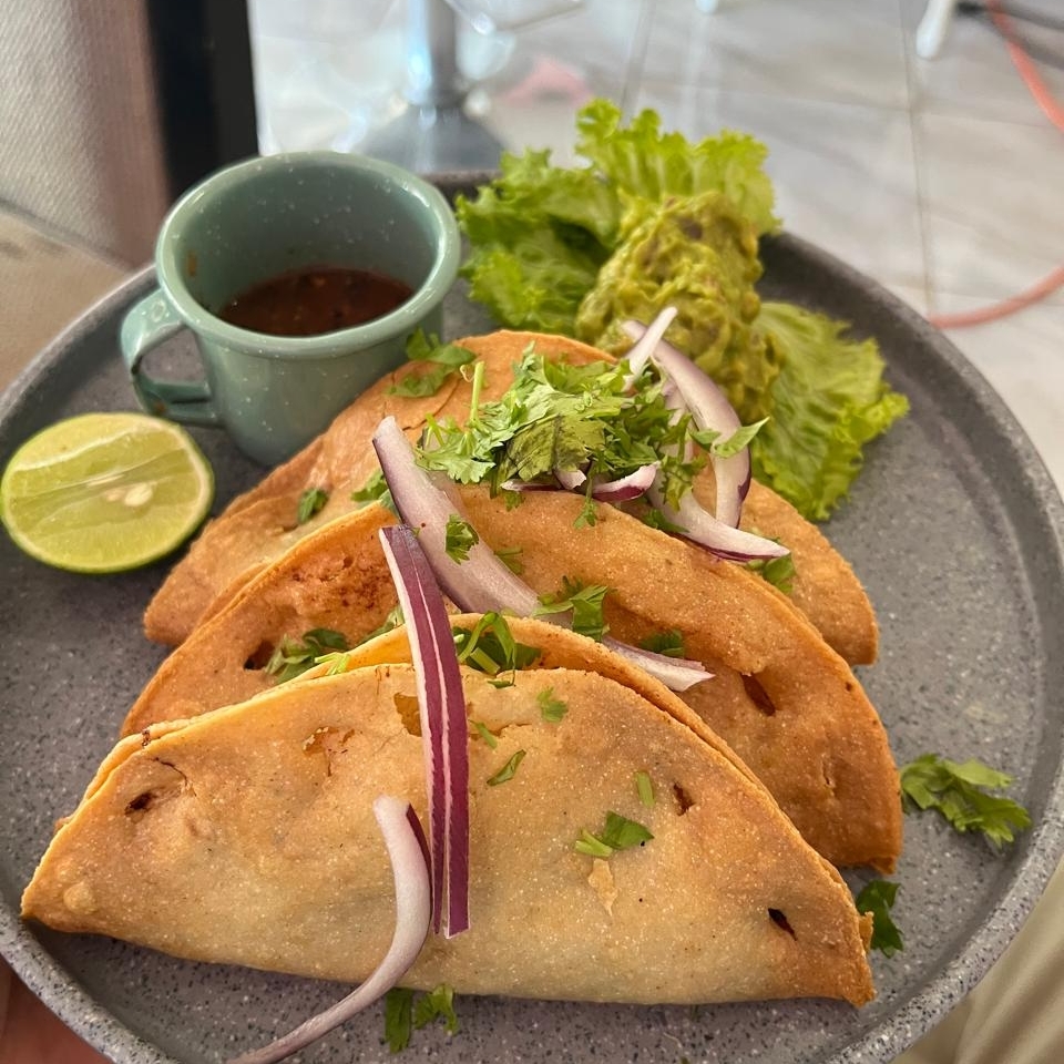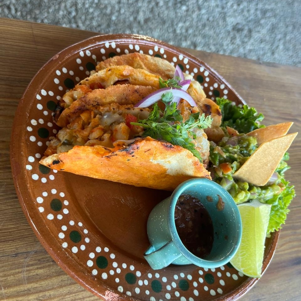 Tortilla de maíz frita, rellena de machaca de camarón, acompañado con guacamole, salsa tatemada y decorado con su respectivo curtido de cebolla morada.