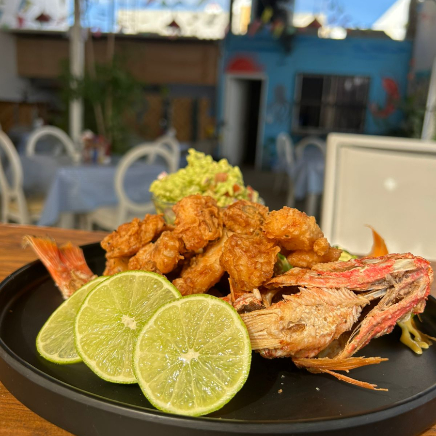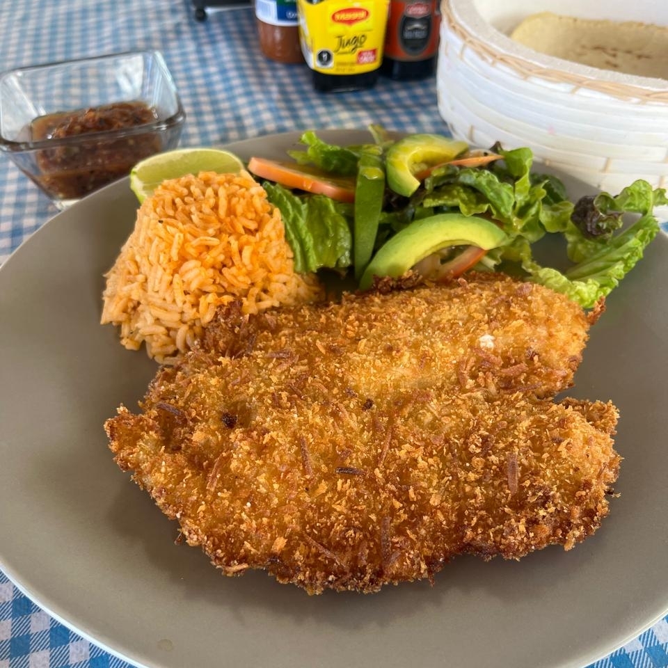 Pescado frito, acompañado com tortillas hechas a mano, salsa tatemada, arroz, ensalada aderezada con una vinagreta de miel-mostaza.