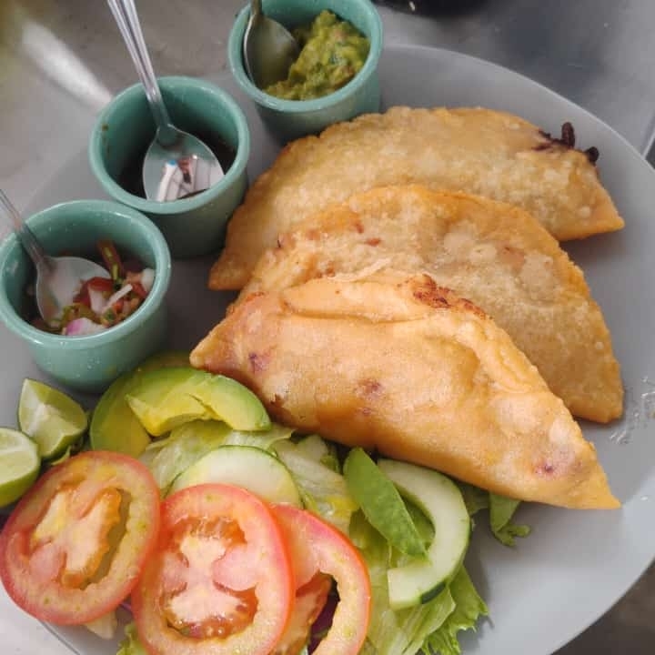 Fritas, rellenas de un guiso de pescado y queso, acompañadas con salsa tatemada y guacamole.