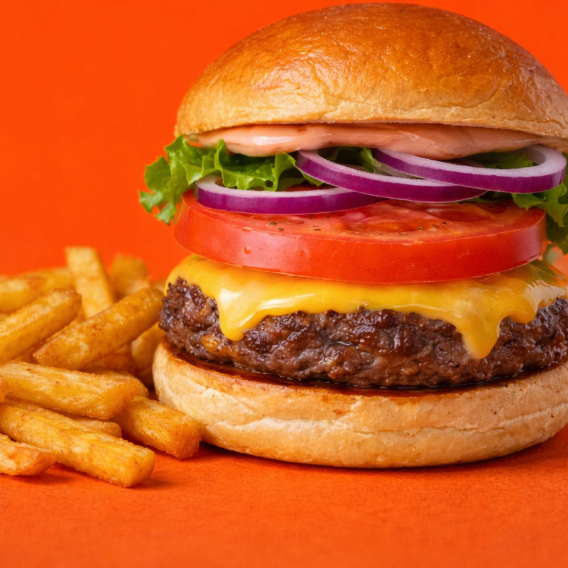 Una jugosa carne de res de ¼ de libra a la parrilla, acompañada de queso amarillo fundido, lechuga fresca y crujiente, rodajas de tomate, y cebolla cortada al momento. Todo esto, realzado con nuestro aderezo especial de la casa y servido en un suave pan brioche ligeramente dorado. Un clásico irresistible con el balance perfecto de sabor y textura.
