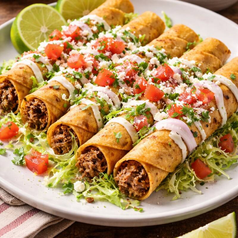 Crujientes tacos dorados rellenos de jugosa carne de res, dorados al punto perfecto. servidos con de lechuga, acompañados de tomate, cebolla morada, crema suave y queso rallado. Incluyen limón al lado para darles ese toque ácido irresistible.