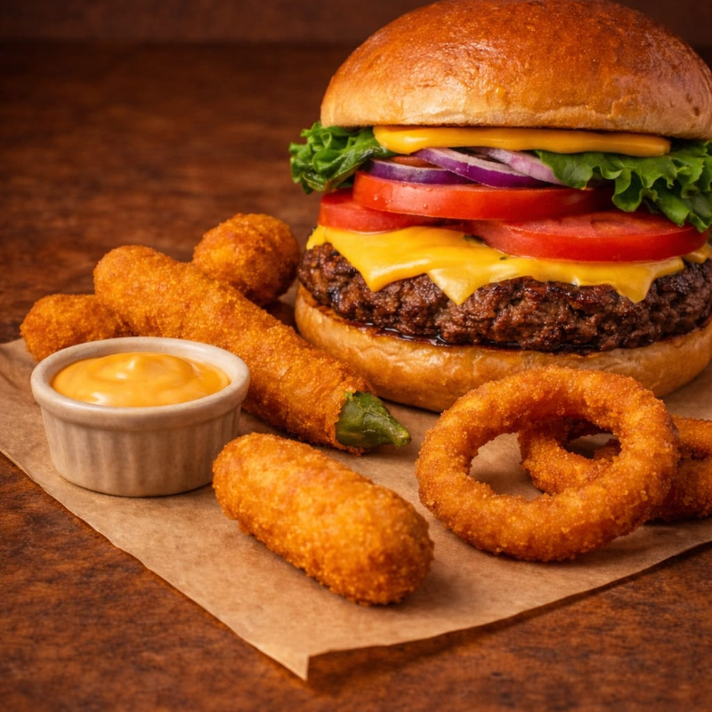 Con todo el poder de la casa, es una hamburguesa clasica, carne, queso amarillo, lechuga tomate y cebolla todo montado sobre un pan brioche y acompañado de 2 aros de cebolla, 1 dedo de queso y un jalapeño popper, ideal para una sola persona.