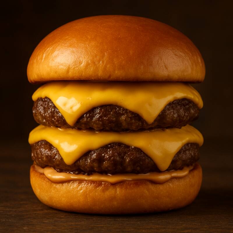 Una explocion de sabor en cada mordida, dos jugosos medallones de carne 100 porciento de res, cubierto de queso amarillo derretido y nuestro inigualable adhereso de la casa. todo montado sobre un suave pan brioche, ligeramente tostado, para lograr el balance perfecto entre textura y sabor.